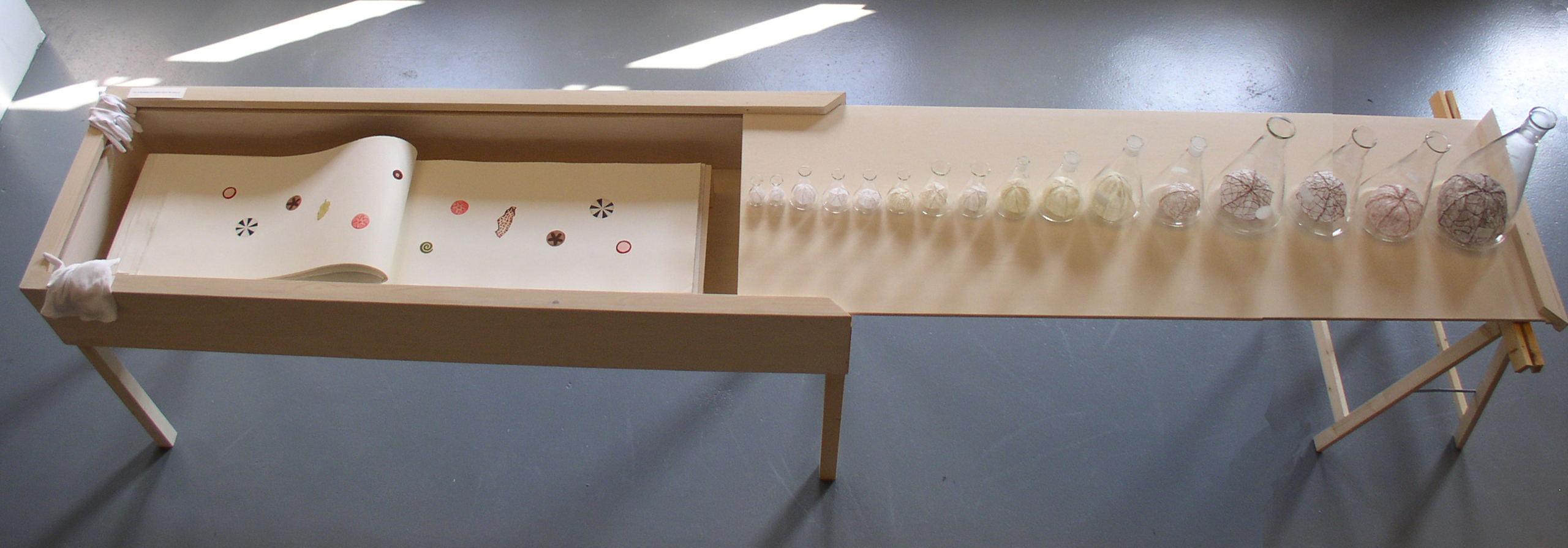 Lia Stouten; boek, ets, blinddruk, foto Jose van Loon; naaigaren zijde, diverse hoogten erlenmeyers