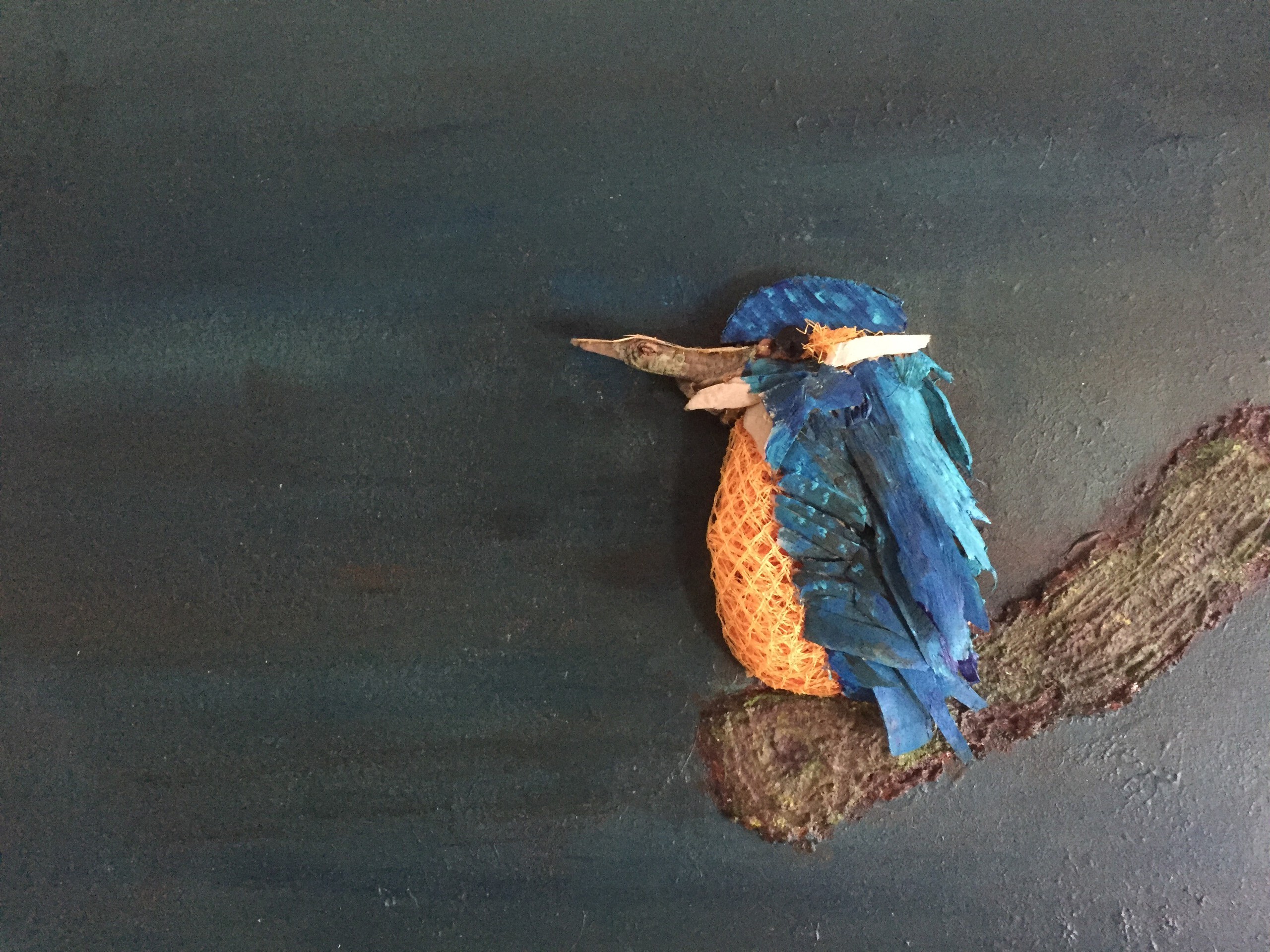 Even twijfel over de groep waar ik mijn ijsvogeltje in kan plaatsen. Ik zou het zaagsel van de schuurvloer van broerlief geen vondsten willen noemen, meer afvalresten. En ja, de netjes zijn het restafval wat overgebleven is van de uien en de mandarijnen. Geverfd met resten dus.