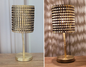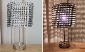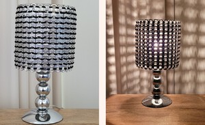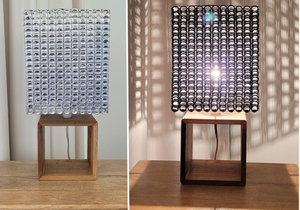 Deze lamp heeft een glazen voetstuk met bollen, de lampenkap is gemaakt van lipjes van blikjes