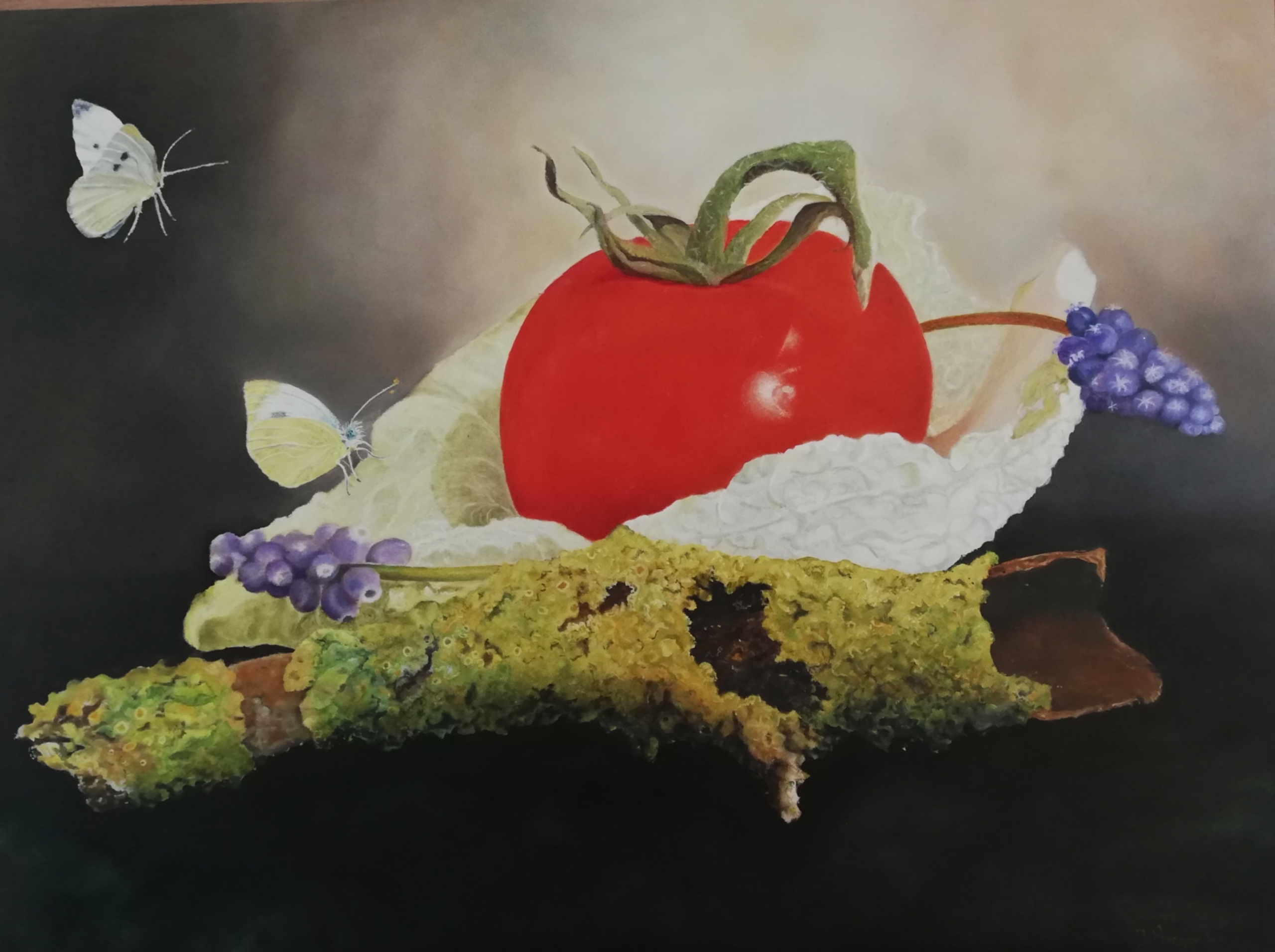 Een stilleven met koolblad, tomaat, blauwe druifjes en een takje vol mos. Het begint met schikken en herschikken van het koolblad, de tomaat, de blauwe druifjes en het takje totdat ik tevreden ben met de compositie. Daarna maak ik een aantal foto's om er uiteindelijk een uit te kiezen om te gaan schilderen. Eerst maak ik een onderschildering in rauwe omber en titaan wit. Daarna bouw ik het schilderij op in lagen veelal transparante verf. Om de compositie in evenwicht te brengen schilder ik twee vlinders. Tenslotte breng ik de hooglichten aan met dekkende verf. Dit schilderij is gemaakt in de techniek van fijnschilderen.