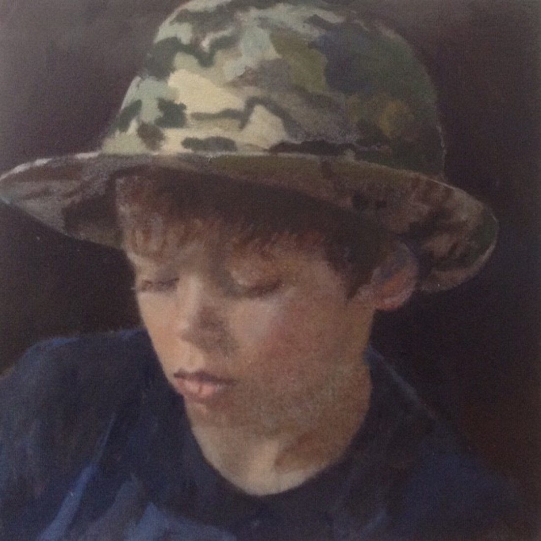 Op een houten kubusje van 10 x 10 x 10 cm schilderde ik op het formaat 10 x 10 cm dit jongetje. Als ondersteuning gebruikte ik foto's.