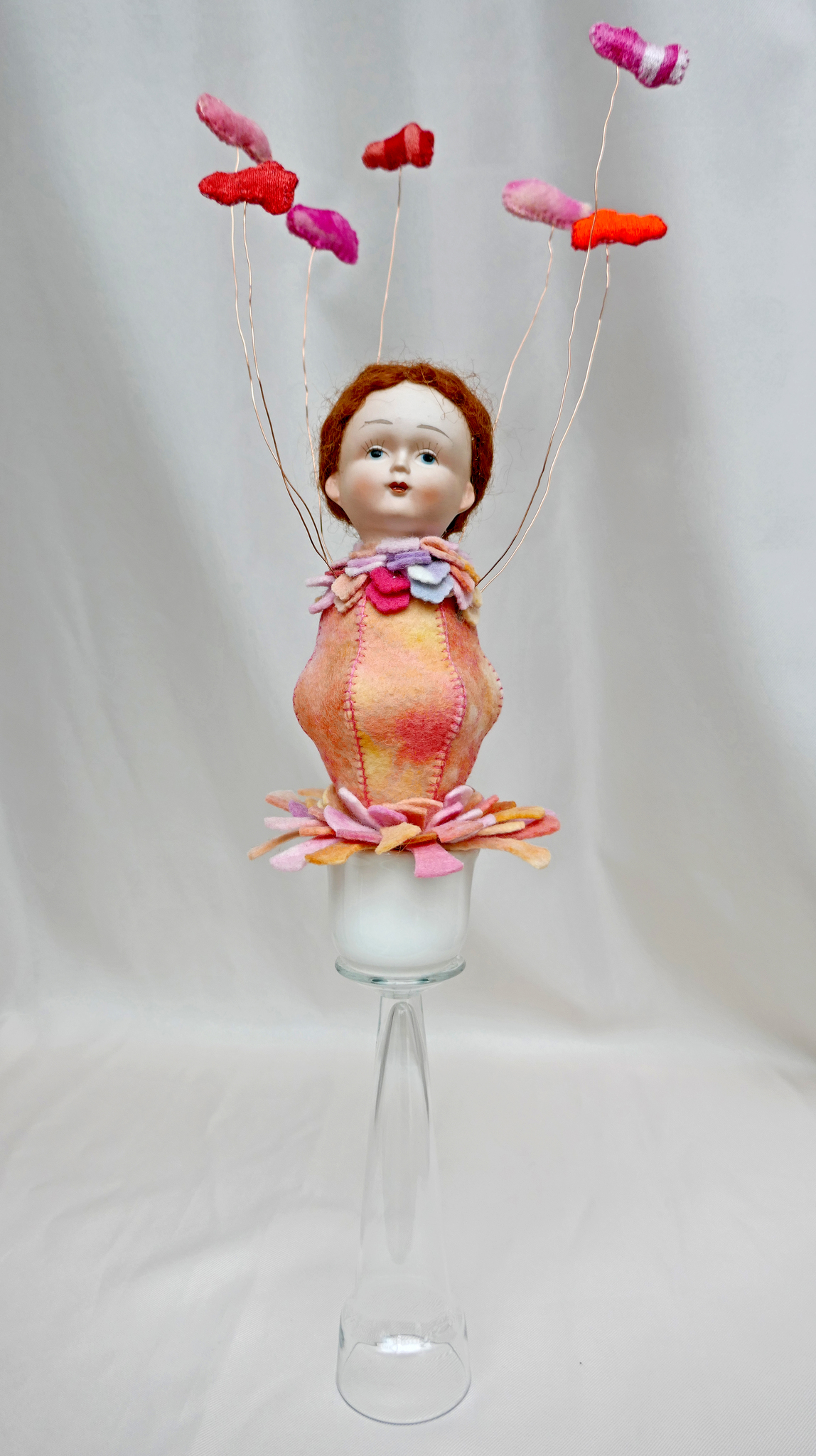 Handgeverfd wolvilt, glansgaren, borduurgaren, keramiek, glas, foam.