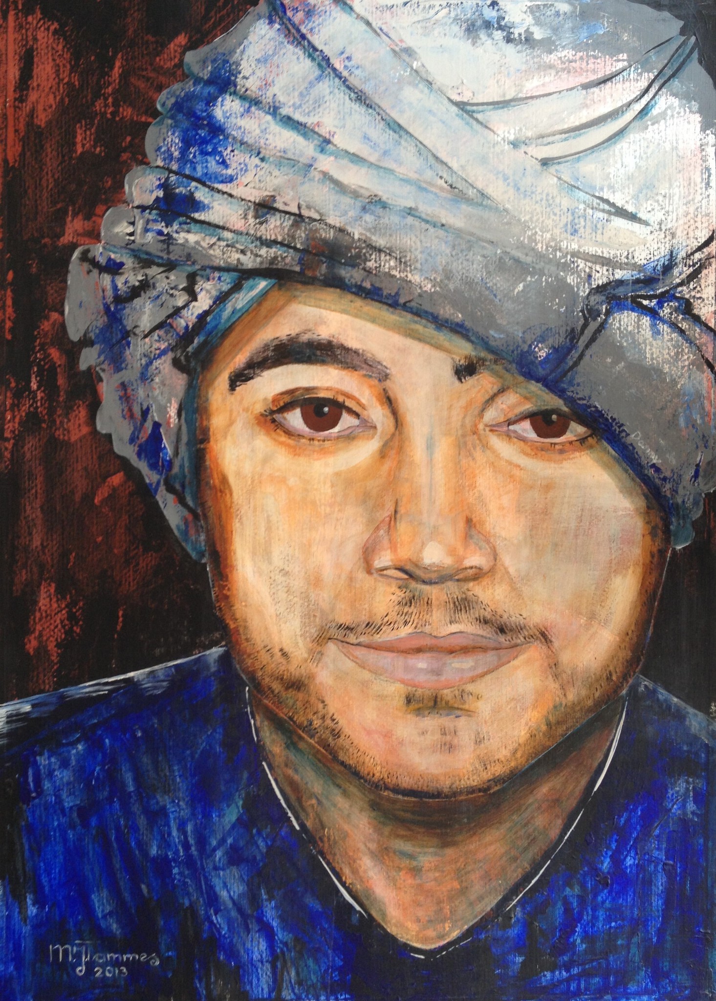 Grijs Blauw Acryl Papier Tulband Jongensportret
