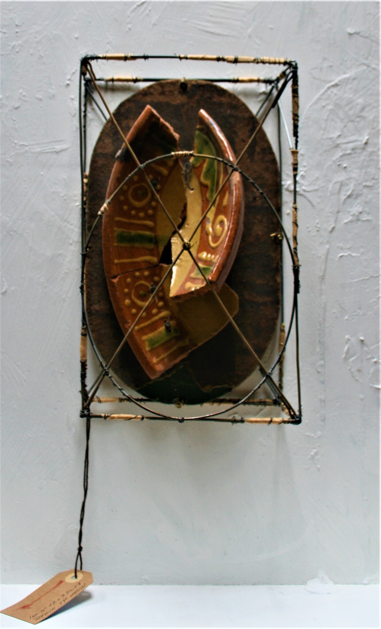 laat-middeleeuwse scherven, ijzerdraad, bladlood, acrylverf, oliepastel, hout, tape
