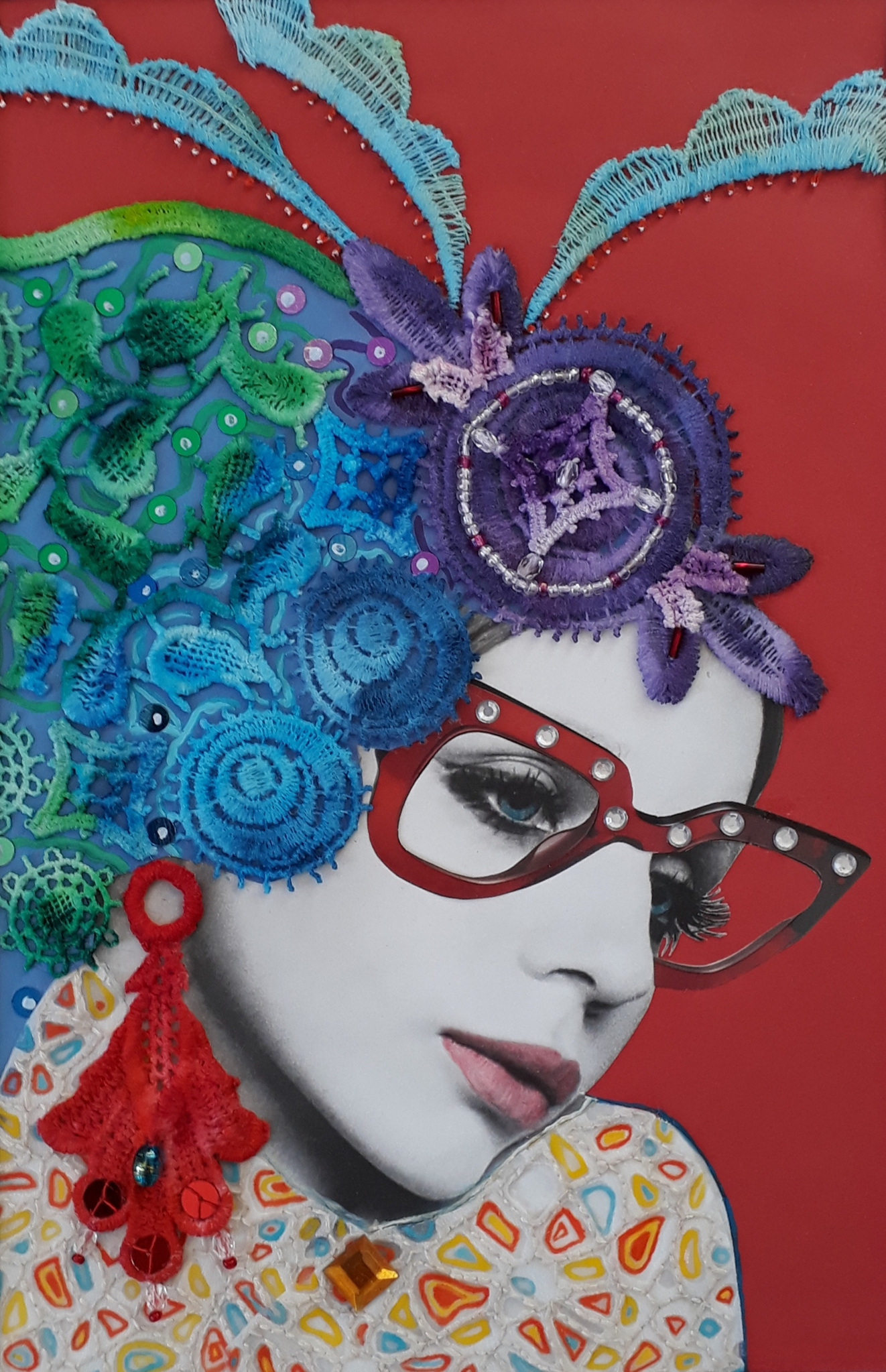 Wit Abstract Figuratief Modern Rood Geel Zwart Blauw Kleurig Portret Hout Mixed Media Ijzer Bril Figuur Object Handgemaakt Serie Schilderijen Collage Uniek Design Kant Sculptuur
