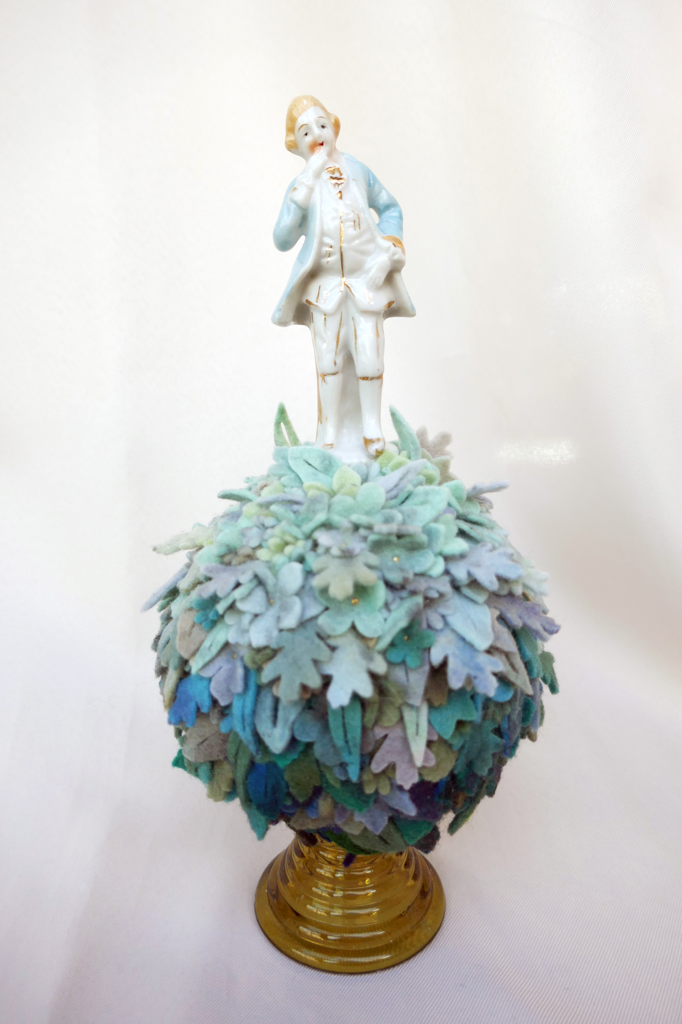 Deels handgeverfd wolvilt, keramiek, glas, foam, kopspelden.