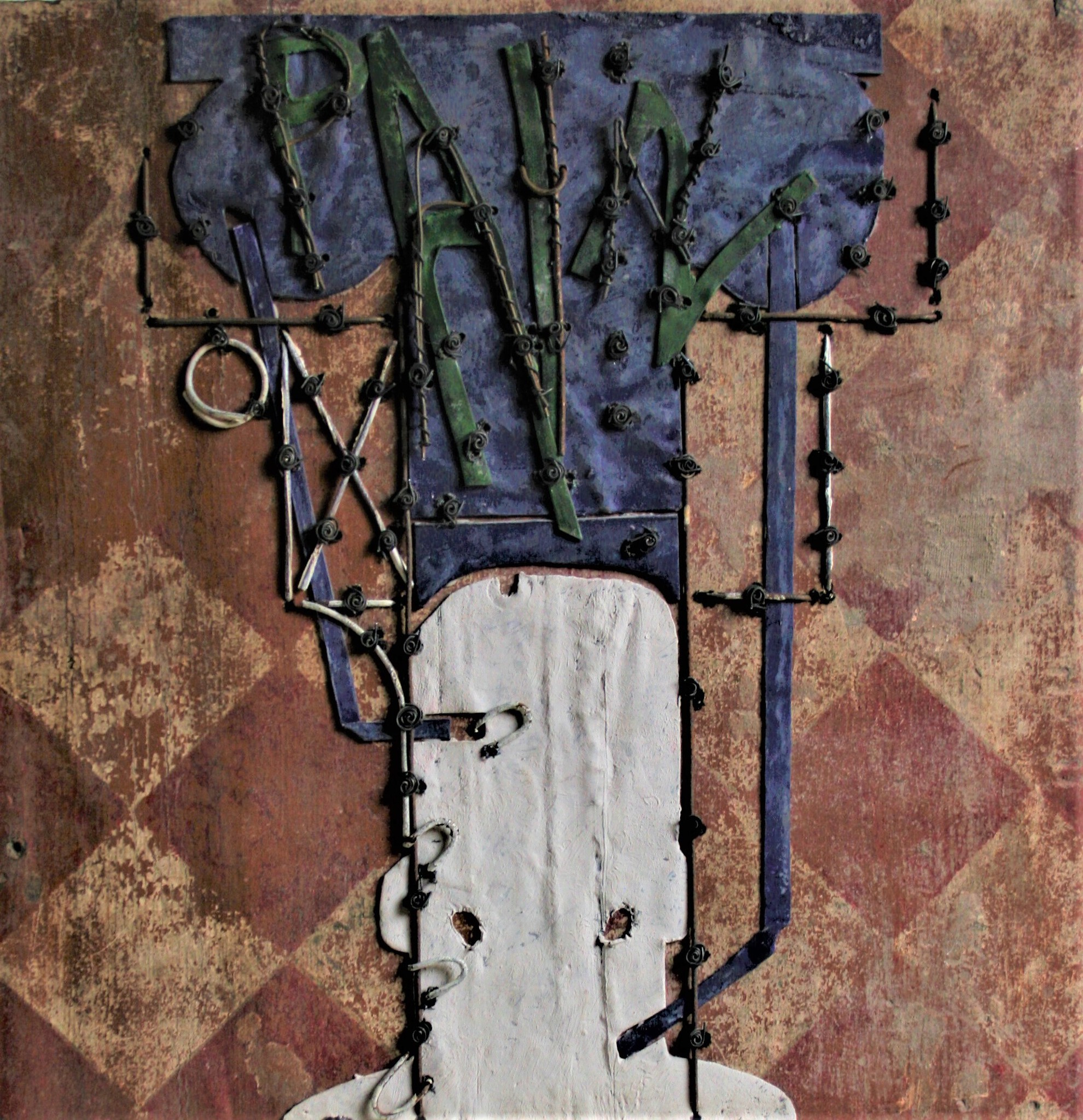 afval, ijzerdraad, hout, acrylverf, oliekrijt, bladlood, balatum
