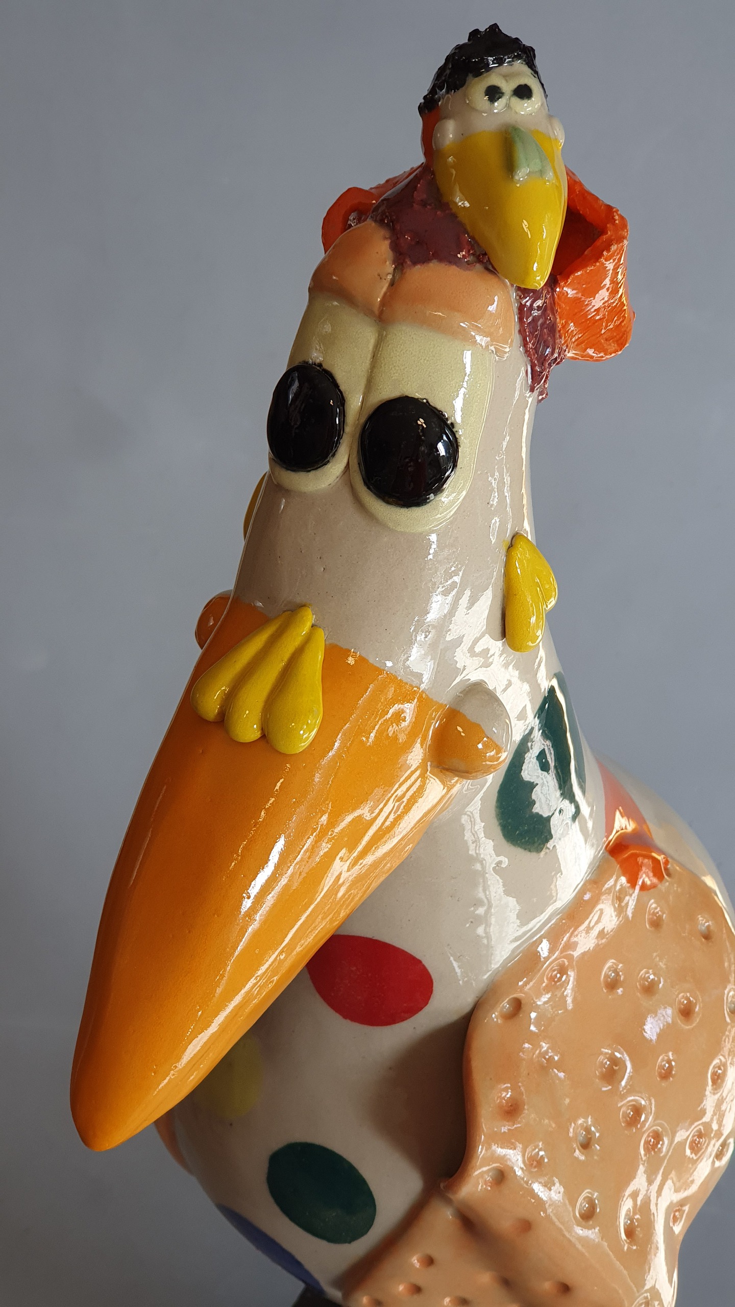 Deze vrolijke vogel heeft een kleintje op haar hoofd en grote gekleurde stippen op het lijf.