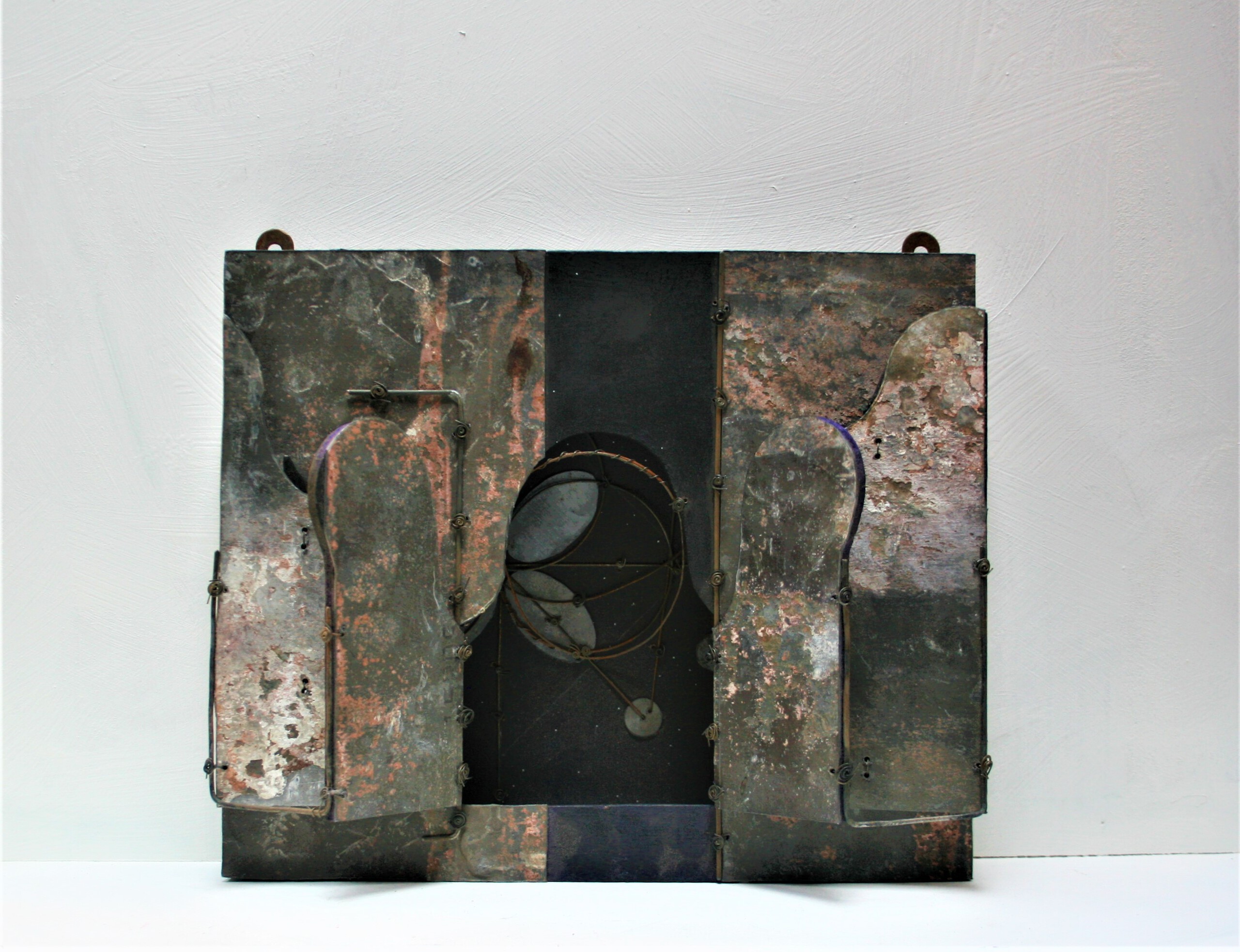 houten kastje, bladlood, ijzerdraad, potlood, tape, oliekrijt, acryl, papier, karton