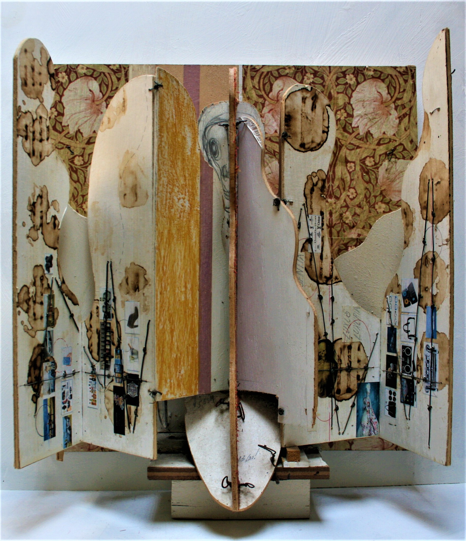 hout, oliekrijt, acryl, ijzerdraad, potlood, decoupage tijdschriften