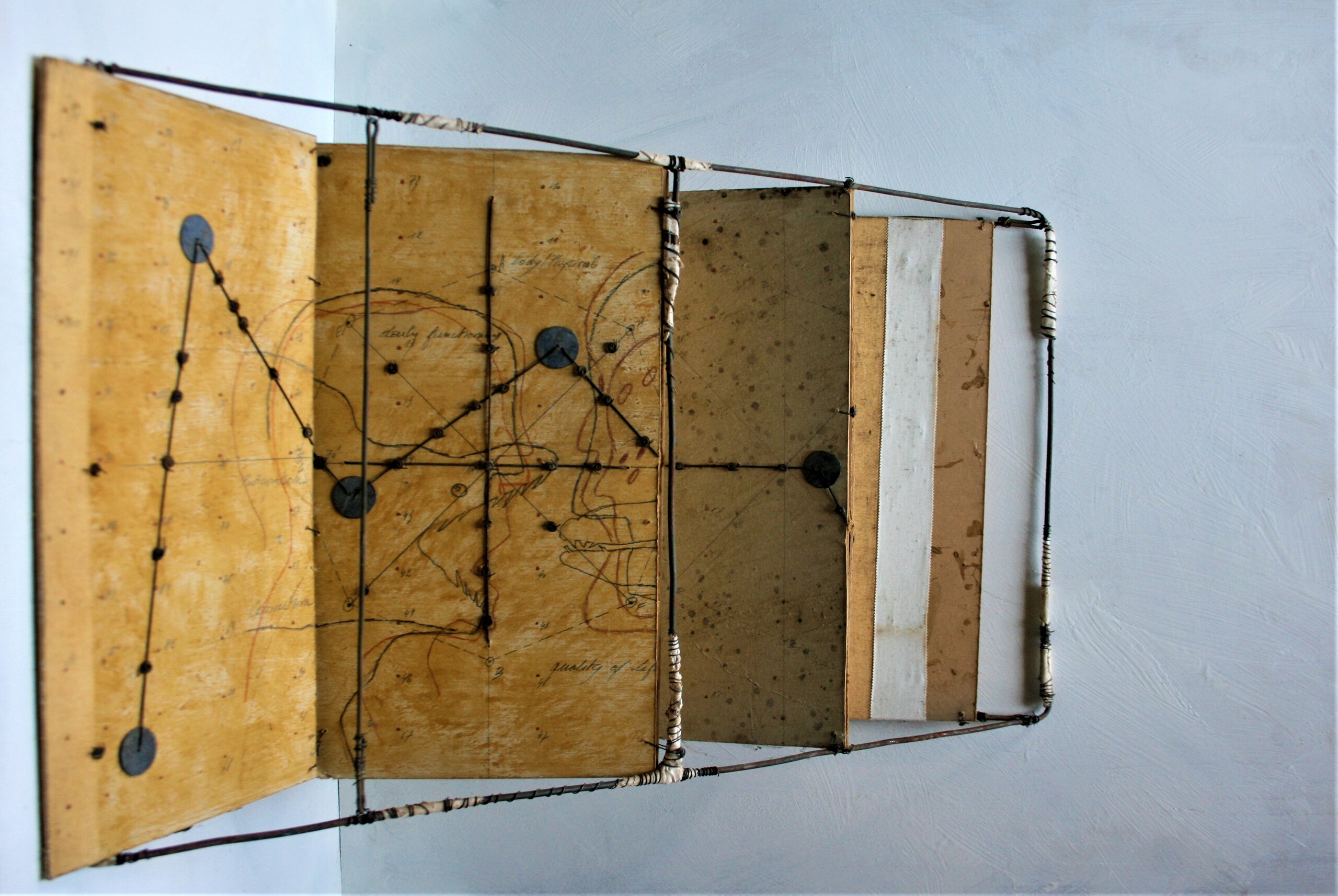 ijzerdraad, zink, bladlood, hou, stof, schapulieren, fragmenten plastic speeelgoedbeestjes, acryl, oud papier, oud karton