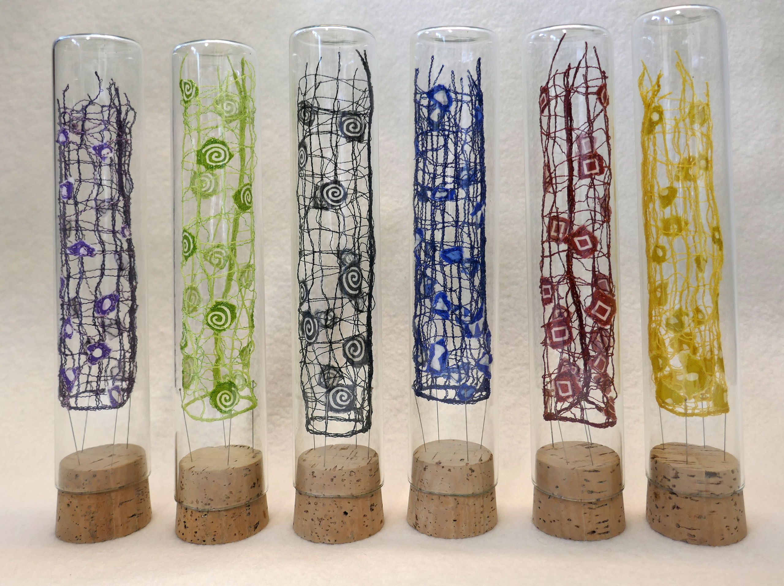 Lia Stouten; grafiek op rijstpapier + Jose van Loon; textiel naaigaren, laboratorium glas, kurk.