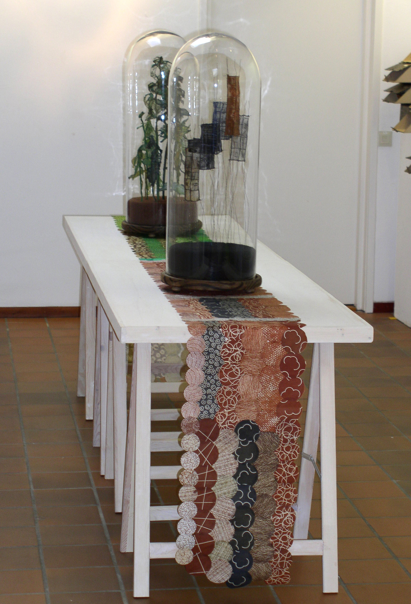 Lia Stouten: ets op rijstpapier Jose van Loon; naaigaren, zijde, stolp, h 75 cm