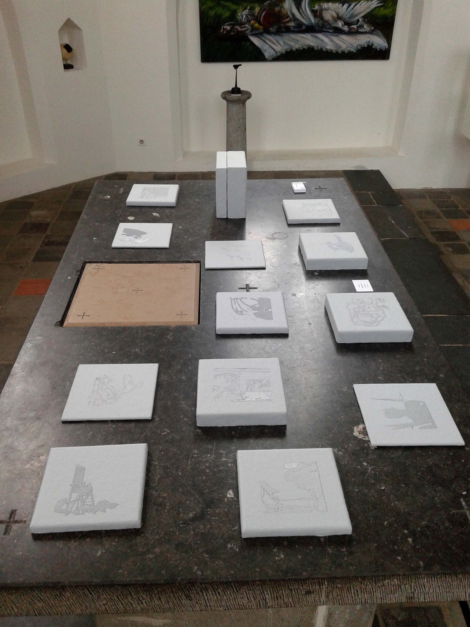 Installatie Vervloeien op altaar in het Kerkje van Persingen, 2015. Vervloeien; glansgaren op vilt +schilderdoek, diverse diktes, 2014 Deels verkocht. 3 stuks bij ME & MORE