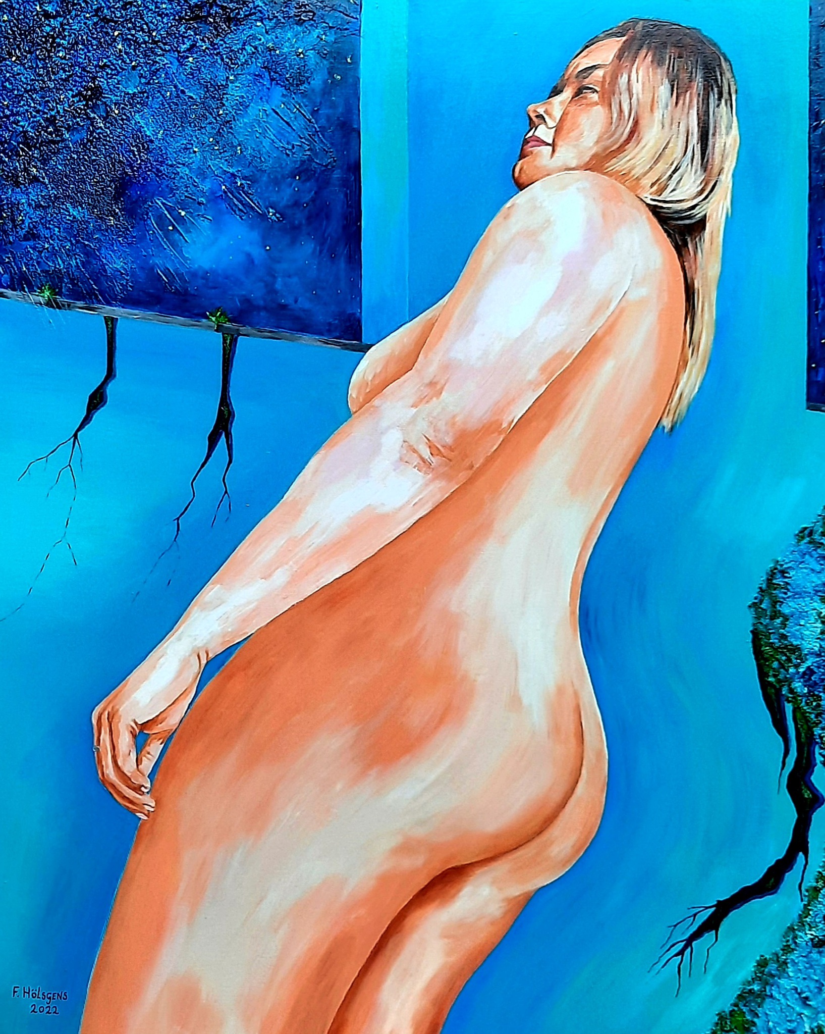 "Rear Window" is een realistisch schilderij van een mooie jonge vrouw, geschilderd vanuit een laag standpunt. Zij is ook te zien op het kunstwerk "Temptation" uit 2020. Omdat ik gekozen heb voor een laag standpunt gaat de aandacht meteen uit naar haar prachtige billen. Maar het totaalbeeld waarbij haar intense blik, starend in de sterrennacht ook bepalend is voor de sfeer op dit doek, mag er zeker zijn. Het is het tweede doek in een serie van minstens drie werkstukken.
