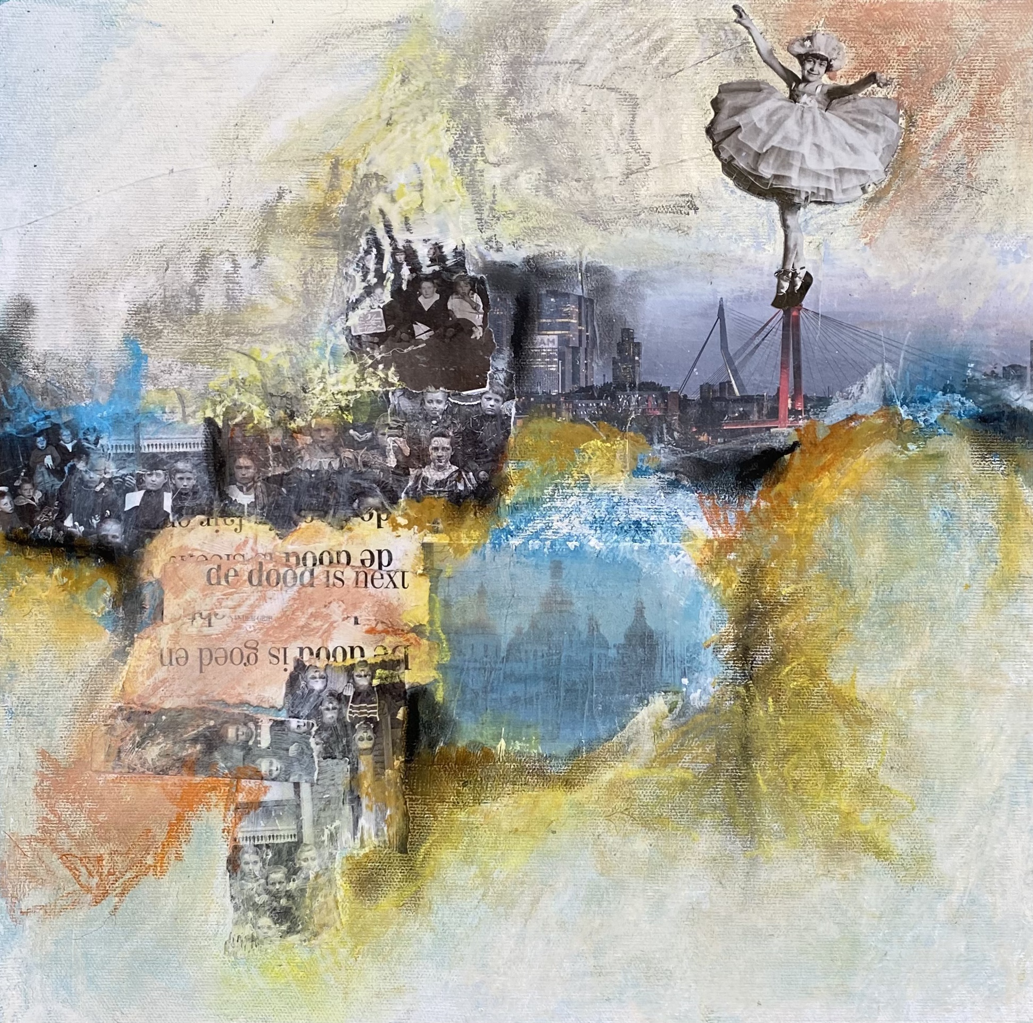 Collage met acryl ingelijst in witte baklijst.