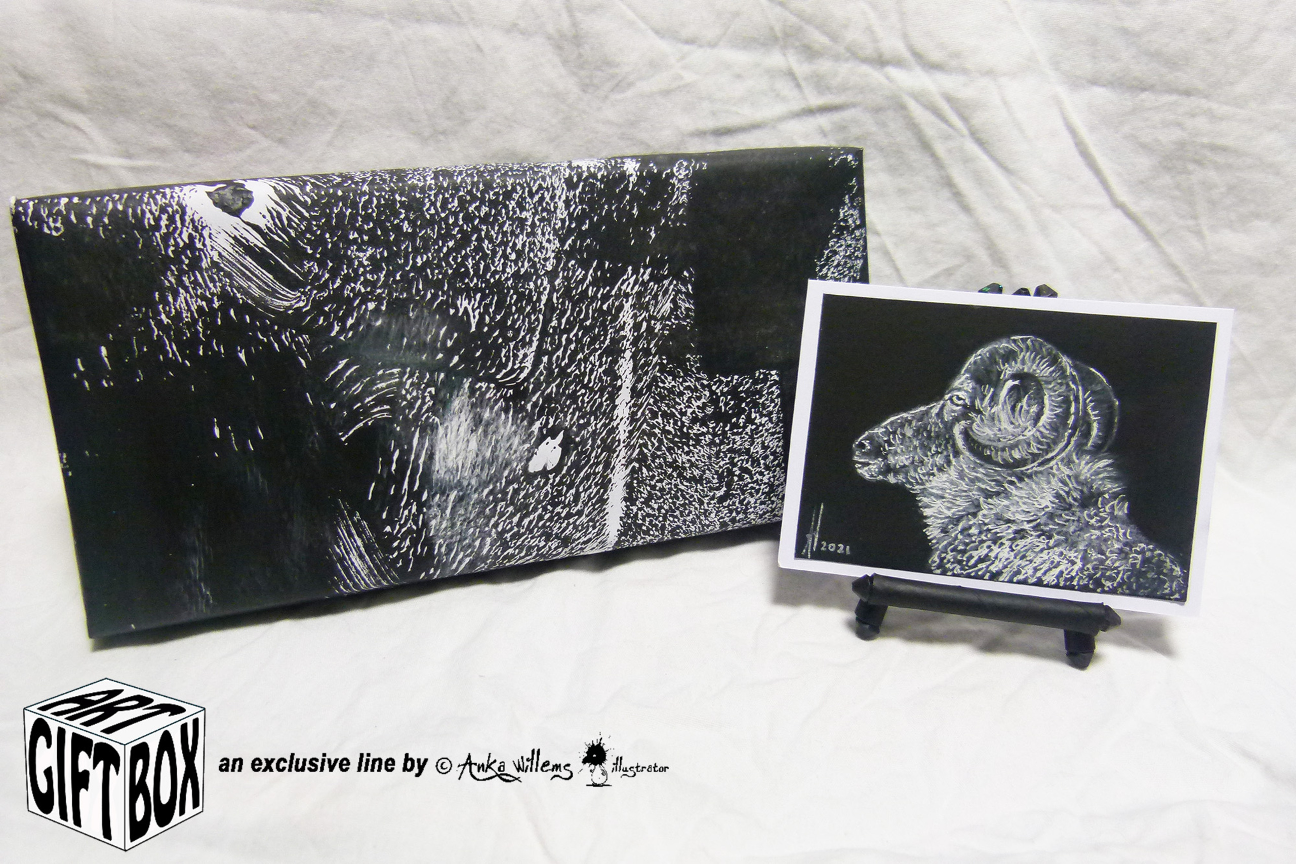 Een mooie zwart wit tekening gemaakt met witte inkt op zwart karton. Met bijpassende ezel en herbruikbare verpakking. Afmeting tekening: 9 x 6 cm., ezel: 8 x 5,5 cm., verpakking: 18,5 x 9 x 1,5 cm. Past door de brievenbus. Een origineel kunstwerk