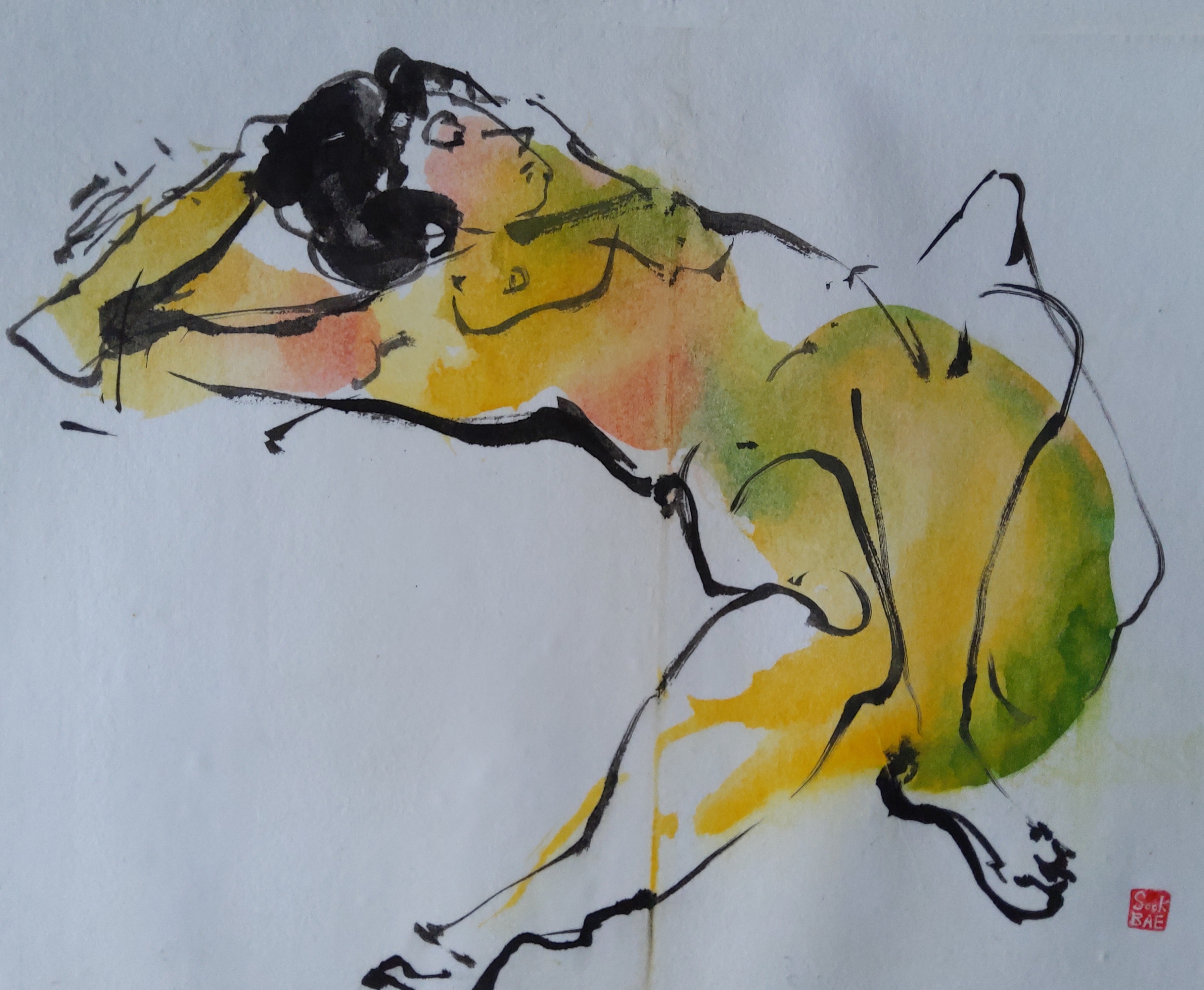 Sook Bae(1959)is in 1980 afgestudeerd aan de young nam college(Toegepast kunsten) in zuid-korea In 1996 volgde zij modeltekenen aan de Grand Academie te parijs Sins 1997 woont ze in Amsterdam. "ik teken en schilder direct naar model Het onderwerp dat my blijvend inspireert is de mens; poserend of bezig met alledaagse dingen, De techniek van het tekenen is sumi-e is mijn grote Liefde. Als ik goed bezig ben, werken mijn ogen en handen Samen en is mijn hoofd leeg; het voelt als een Meditatie"