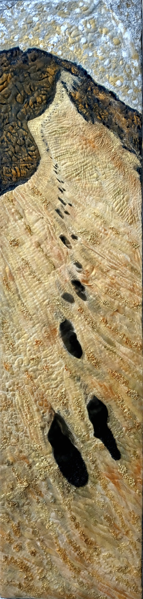 Ik ben een materialen mens, en maak samenvoegingen van verschillende materialen; foto’s, stoffen en borduursels, soms ook gecombineerd met hout, lood en steen, op wisselende formaten