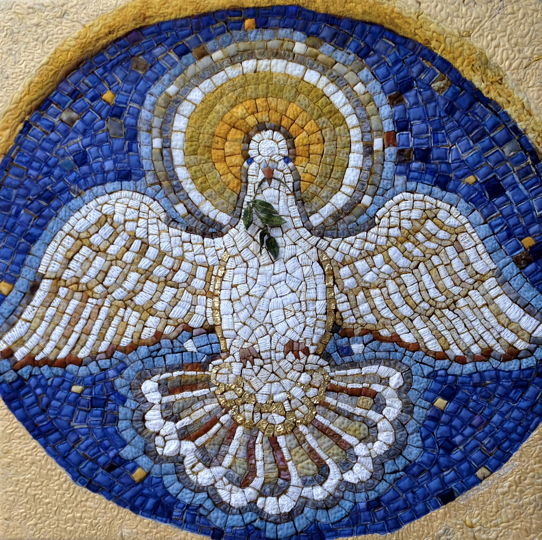 Duif Vrede Olijftak Heilige Geest Blauw Geel Mozaïek Reliëf Metaal