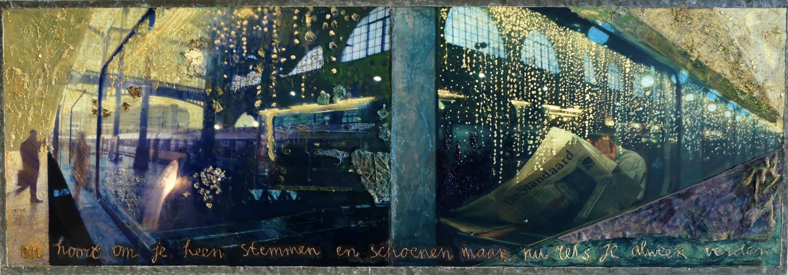 Bewerkte sfeerfotocollage op station Antwerpen Centraal, bewerkt met verf, textiel, draad, glitter, op hout met loden rand tekst: 'en hoort om je heen stemmen en schoenen maar nu reis je al weer verder'