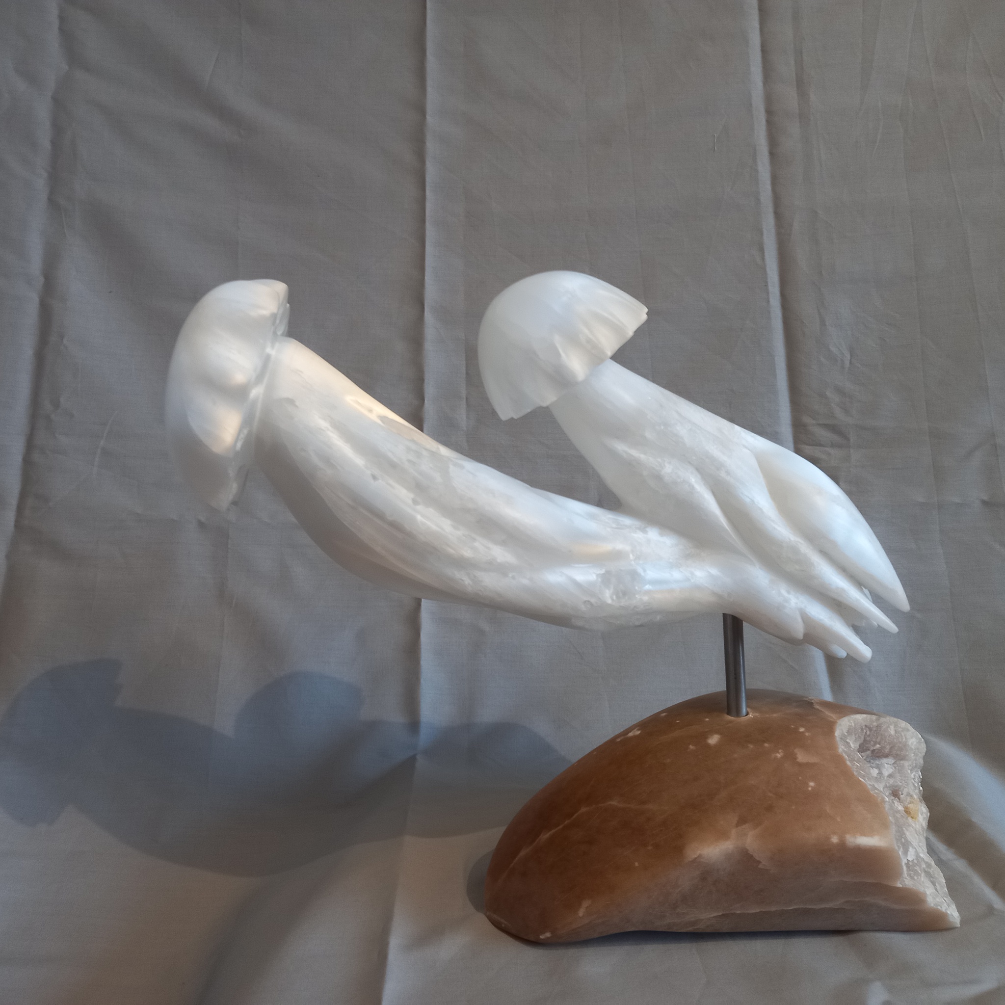 Beeld van 2 kwallen, gemaakt van wit seleniet, met een sokkel van bruine albast.