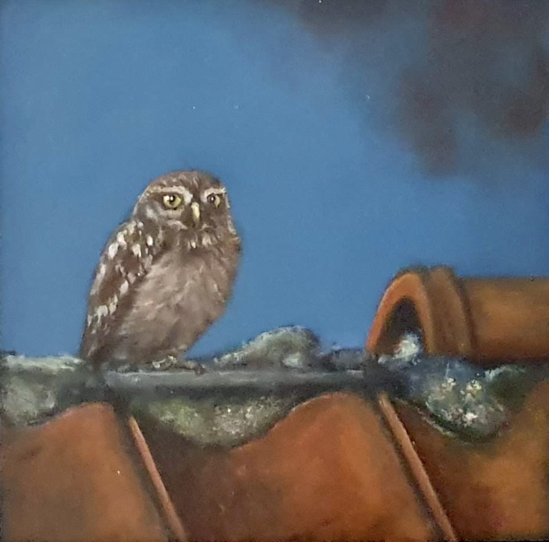 Steenuiltje op het dak in de schemering