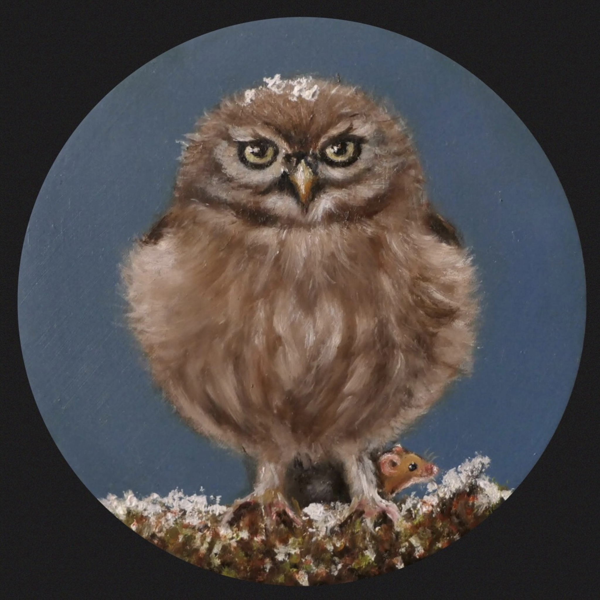 Steenuiltje met muisje in de sneeuw