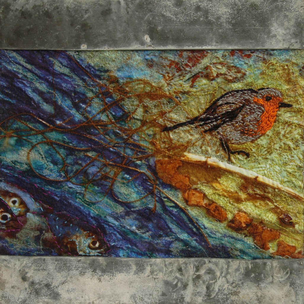 Ik ben een materialen mens, en maak samenvoegingen van verschillende materialen; foto’s, stoffen en borduursels, soms ook gecombineerd met hout, lood en steen, op wisselende formaten