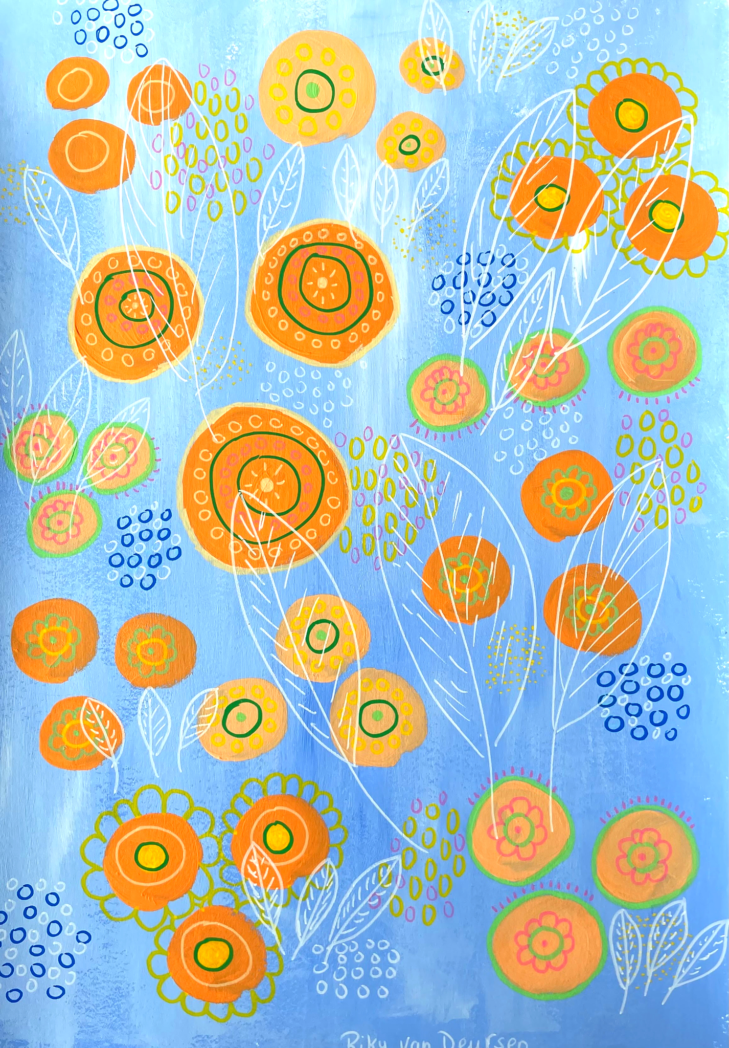 Abstract Oranje Blauw Blue Dots Leaves Flowers Orange Garden Botanical Contemporary Happy Artwork Floral Botanisch Circles Complementary Markmaking