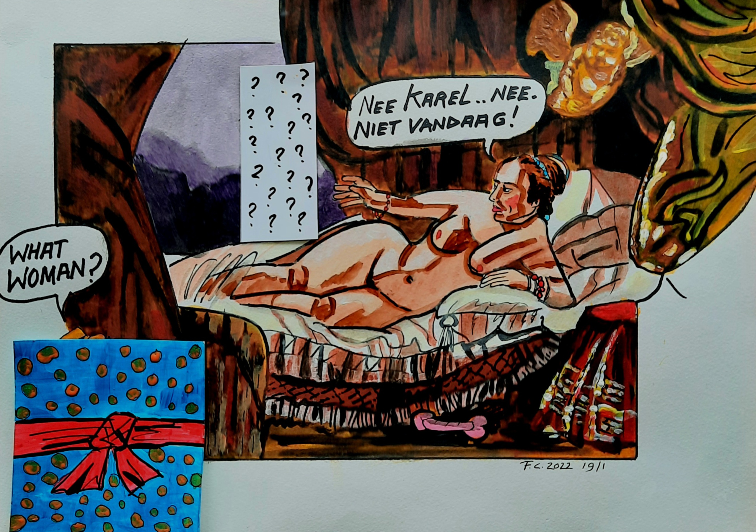 Vrouw Naakt Mixed Media Bed Erotiek Sex Popart Lustig