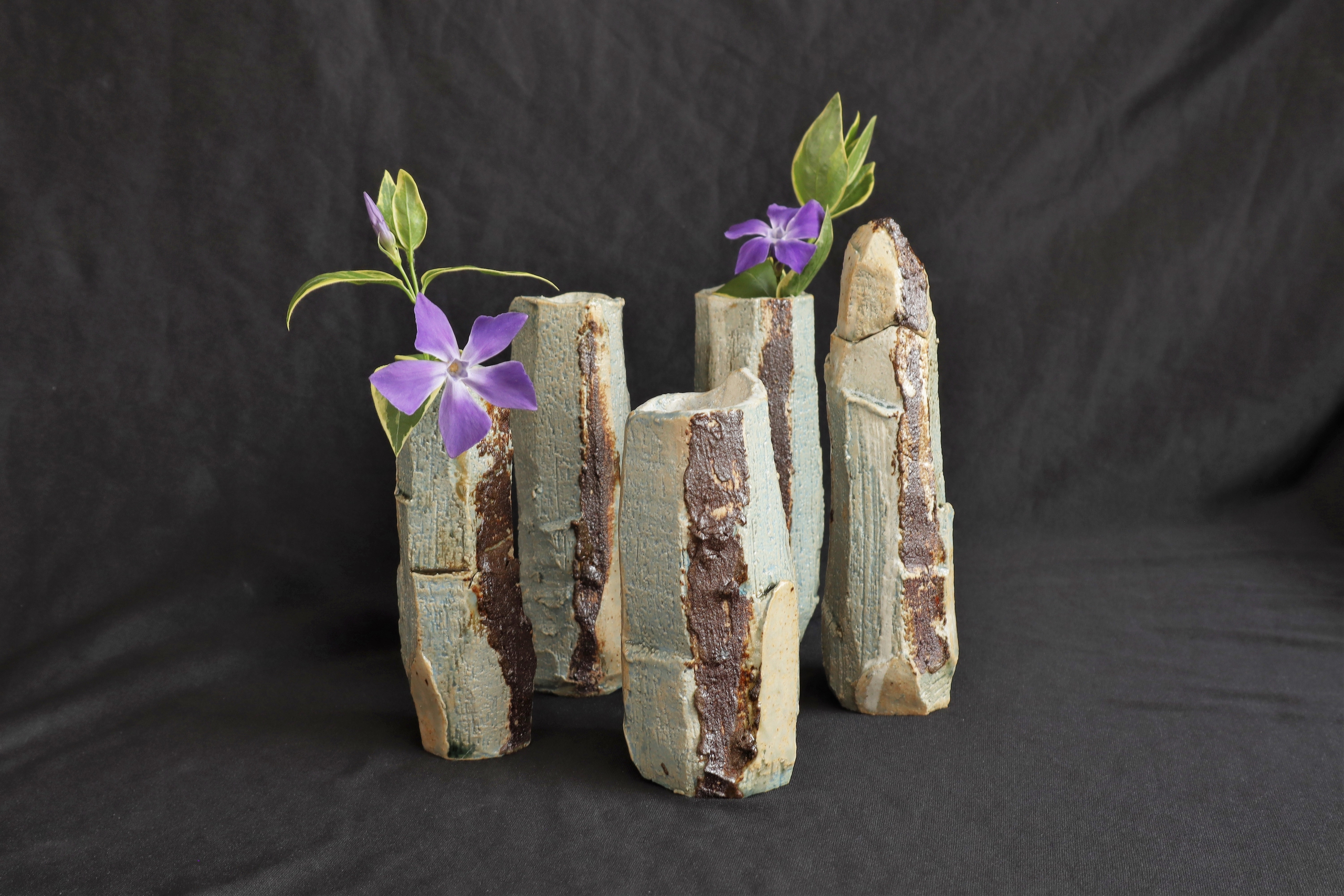 Vier vazen en een vaasdoosje, gesneden uit een blok klei. De kleur komt uit de grond van Oss, met zelfontwikkelde blauw glanzend en as glazuur. Prijs per stuk (nog 1 over).