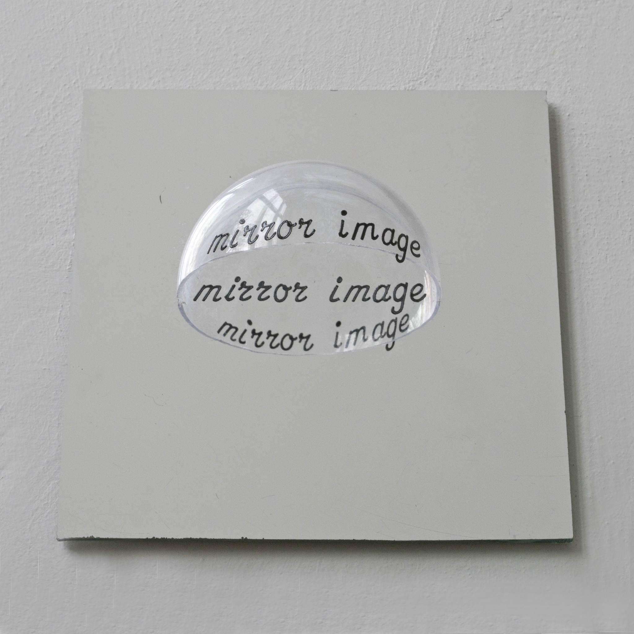 Op een 1/4 doorzichtige bol is "spiegelbeeld "geschreven.Deze 1/4 bol is op een bovenvlakspiegel (optische spiegel) geplaatst. De1/4 transparente bol wordt nu een 1/2 bol Je ziet nu in de spiegel de achterkant van "spiegelbeeld". De achterkant van "spiegelbeeld" is gespiegeld en daarom zie je "spiegelbeeld "in de spiegel weer normaal. "Spiegelbeeld"is ook op de spiegel geschreven. Omdat het een bovenvlakspiegel is vallen hier beeld en spiegelbeeld samen. Het werk is aan de achterkant gesigneerd.
