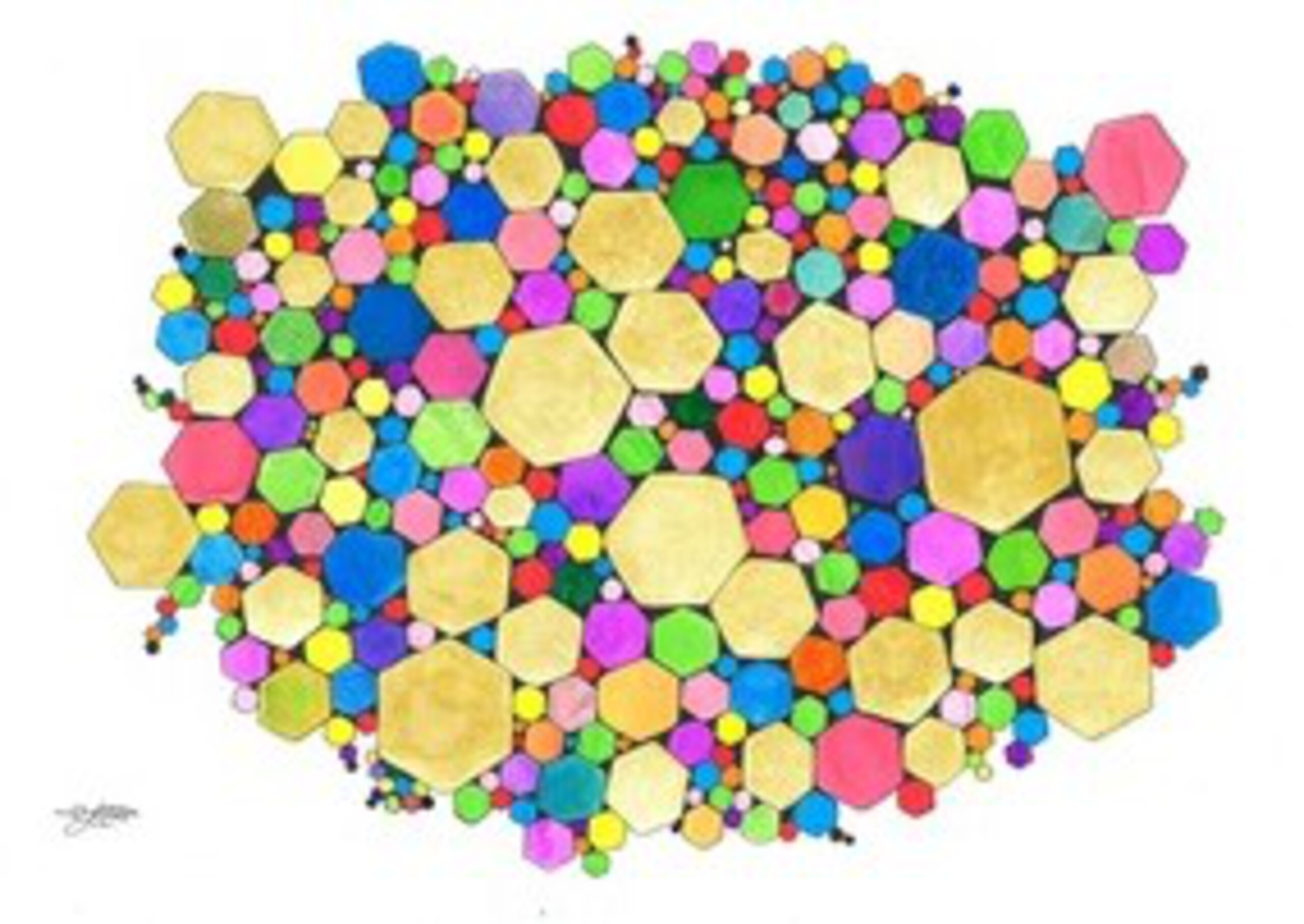 Hexagon is in mijn beleving de perfecte vorm. De geometrische zeshoek is gebruikt in de anorganische scheikunde. Het is ook de vorm van de nest van de meest belangrijke wezen op Aarde: de bij. Van deze pentekening zijn er ook printen beschikbaar. De prijs van een print is € 25,- excl. verzendkosten.