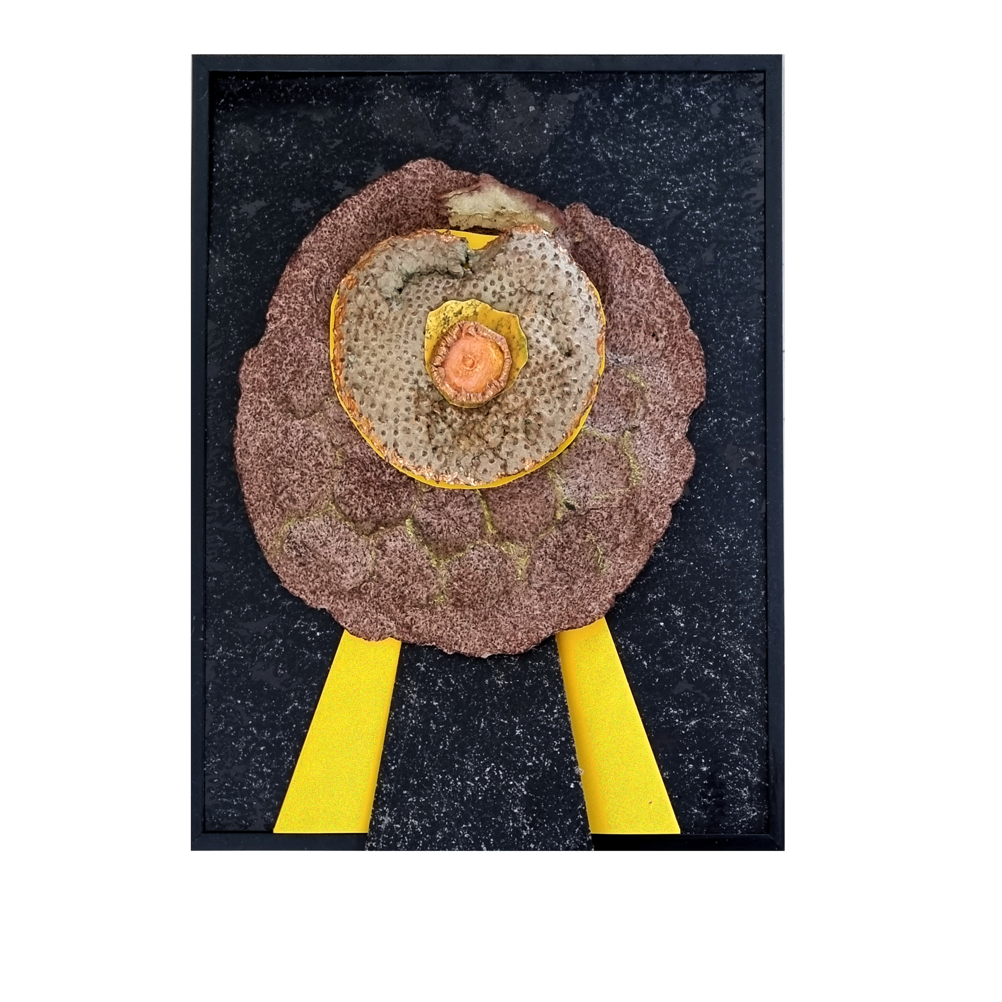 Eerder gemaakte papiervormen komen samen op een achtergrond van gekleurd papier in een lijst.