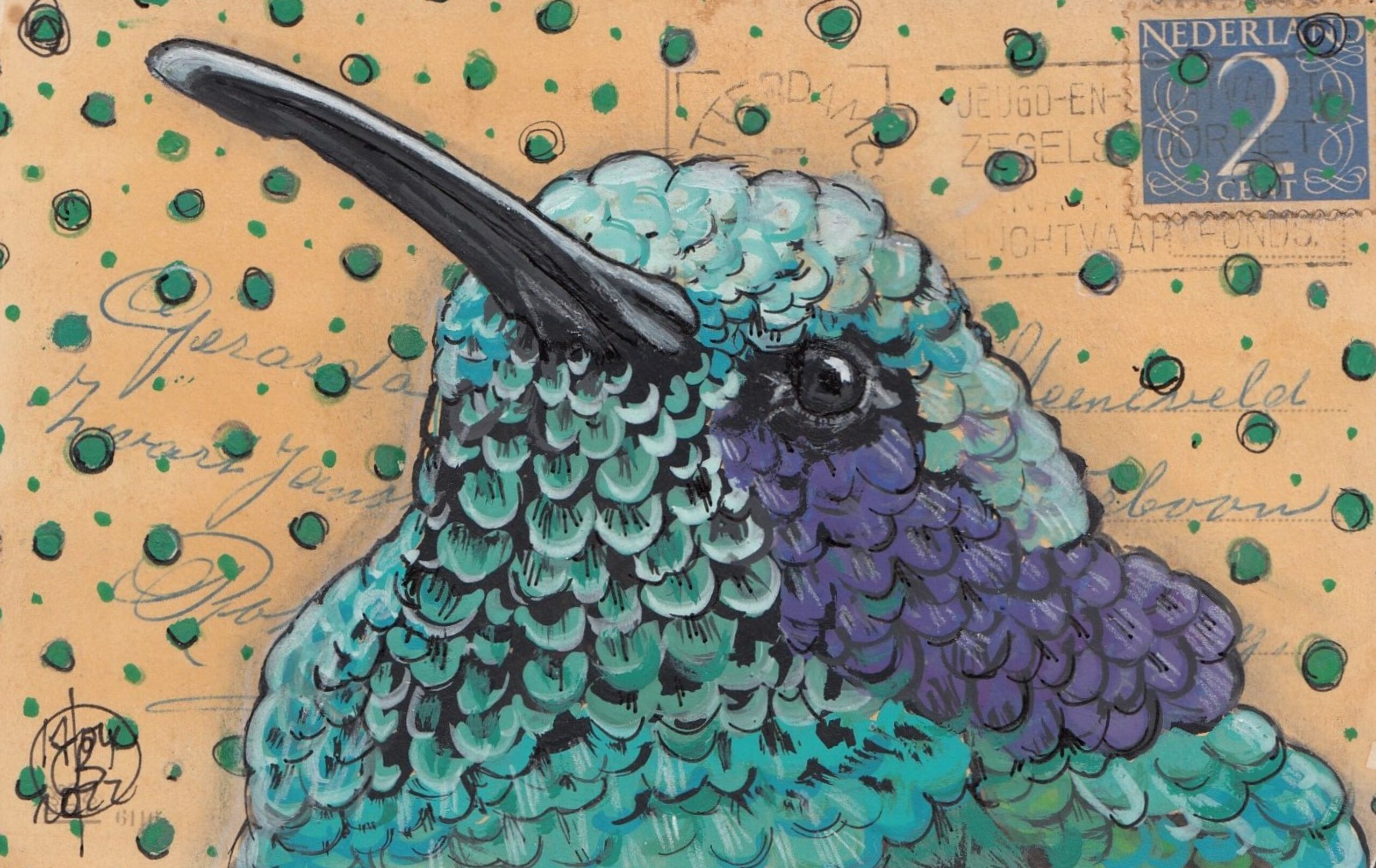 Close up van een kolibri - vrij naar de 'Lesser violetear'. Deze kolibri kan de veren aan de zijkant van de kop opzetten (en uit laten steken), net alsof hij violetkleurige oren heeft. De kleuren zijn een redelijke benadering van de realiteit. De glans benaderen - dat is een illusie, zeker met gouache. Een volgende ronde hoop ik deze bijzondere vogel dan ook in olieverf neer te zetten. Geschilderd op een oude ansichtkaart;aangevuld met pen en kleurpotlood. Het formaat van de kaart is circa 9 bij 14 cm. De kaart is geplakt op een backing van zwart papier (14,8 bij 21 cm). Verkocht (Eclectic art auction, mei 9 tot en met 13 2023).