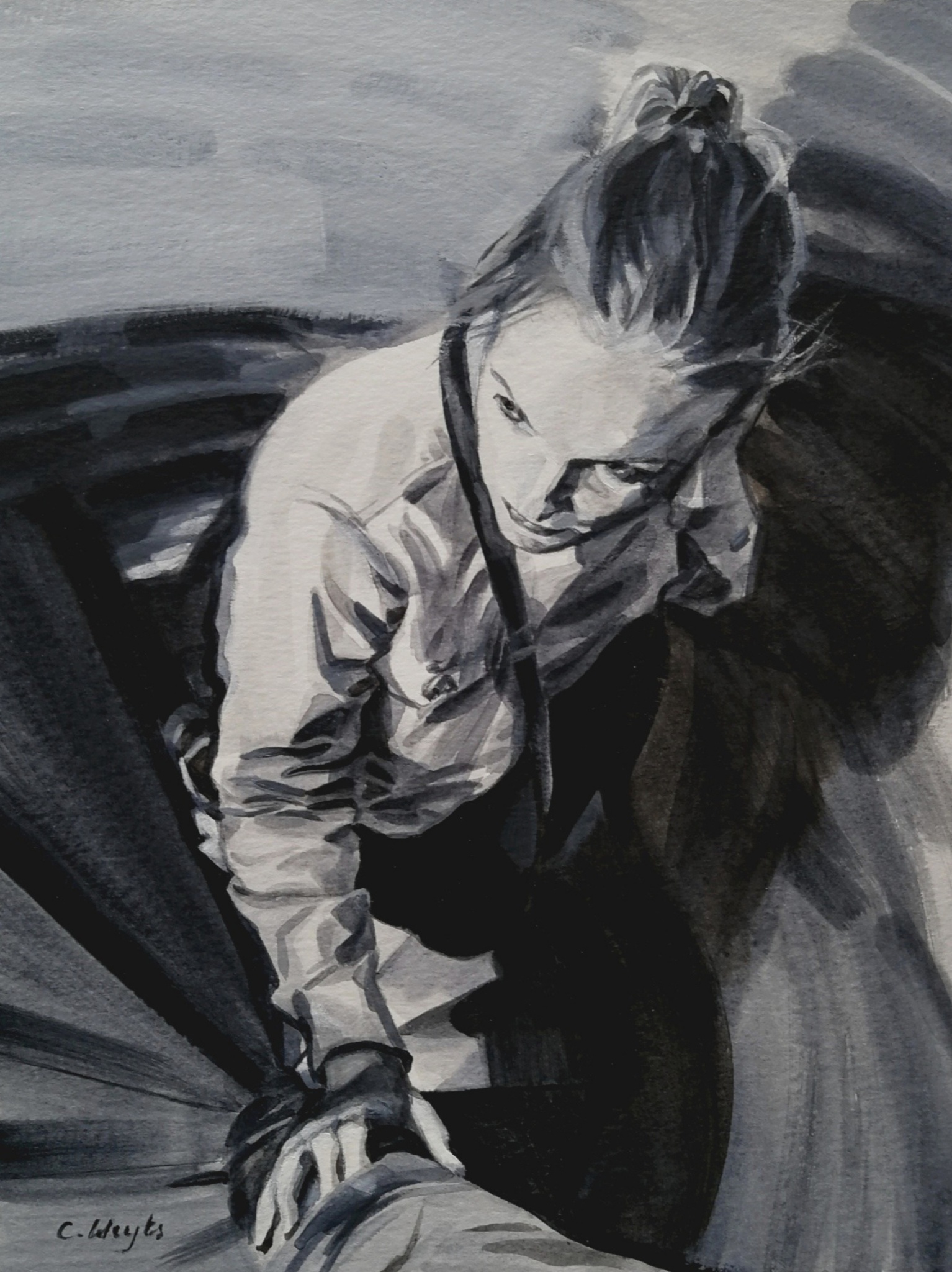 Meisje Acryl Vrouw Papier Spanning Trap Schetsmatig Grijstinten Vogelperspectief