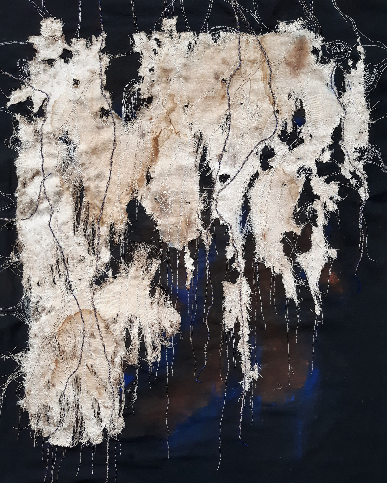 Dit werk heeft voordat ik aan het borduren ben gegaan eerst in de GFT-bak gelegen. Daardoor is het verkleurd, vergaan en verteerd op sommigen plekken. Mooi dus. Daarna met de hand erop geborduurd.