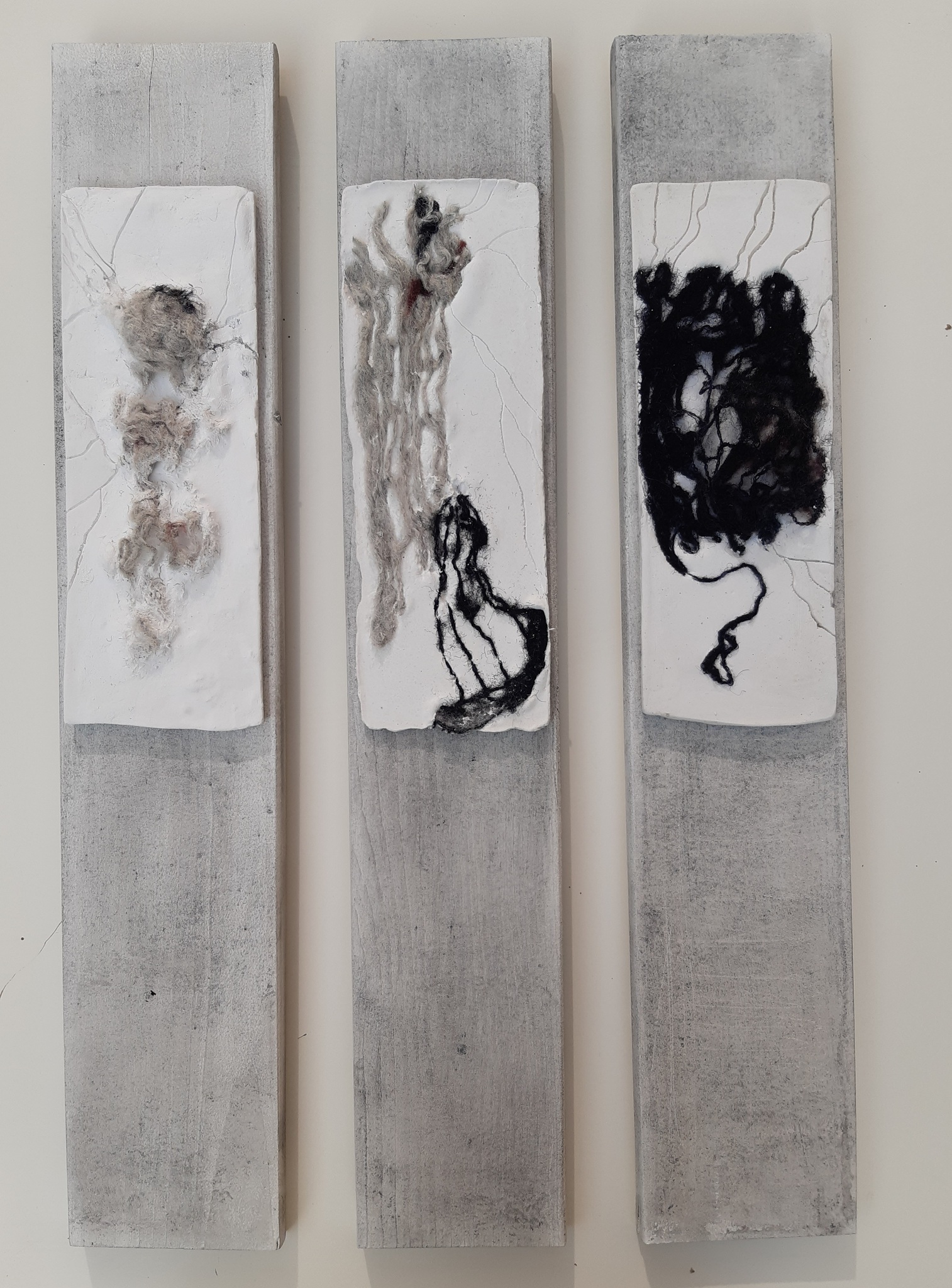 Drieluik. Borduurwerk op/in gips Afm per stuk 8 x 45 cm