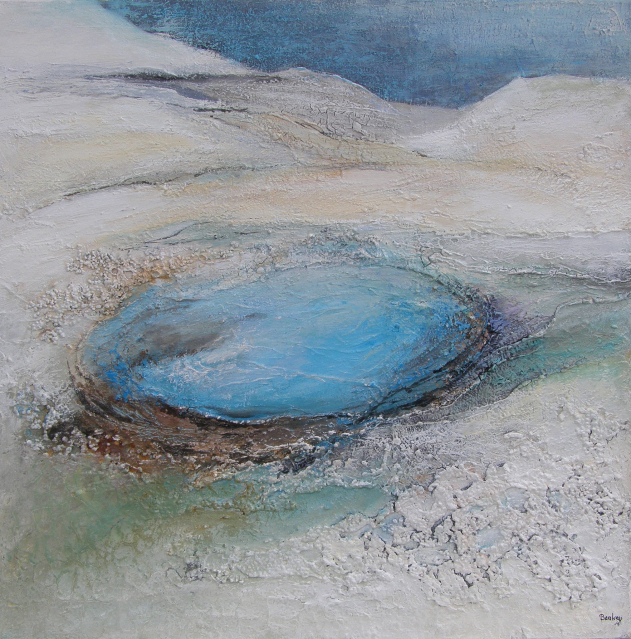 Haar schilderijen in gemengde techniek zijn geinspireerd door haar reizen in binnen-en buitenland. Schetsen en aantekeningen zijn het vertrekpunt, maar worden tot hun essentie in vorm en kleur teruggebracht.