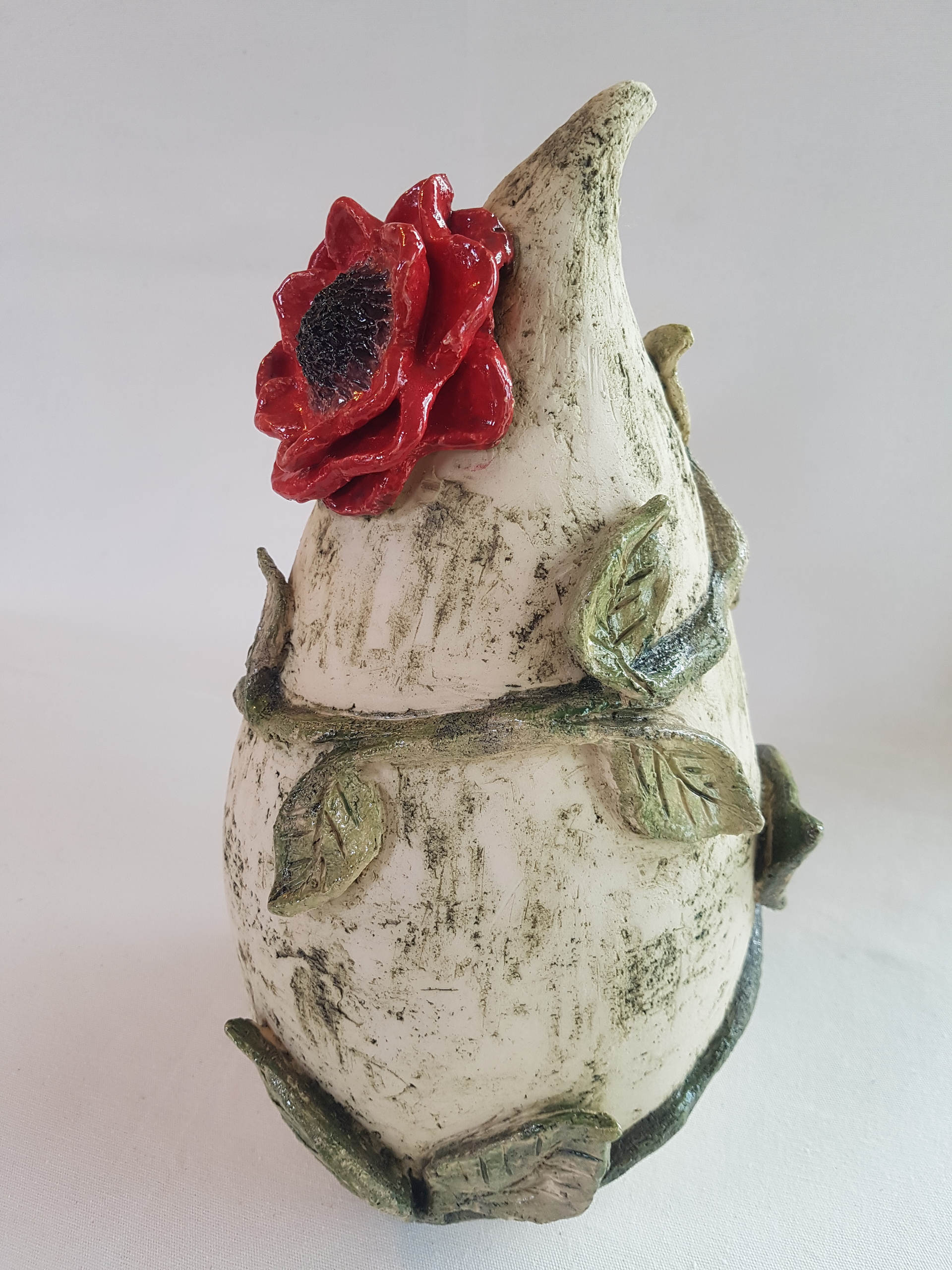 Grote urn uitlopend in een punt met grote rode bloem en bladeren. Inhoud 3 ltr.