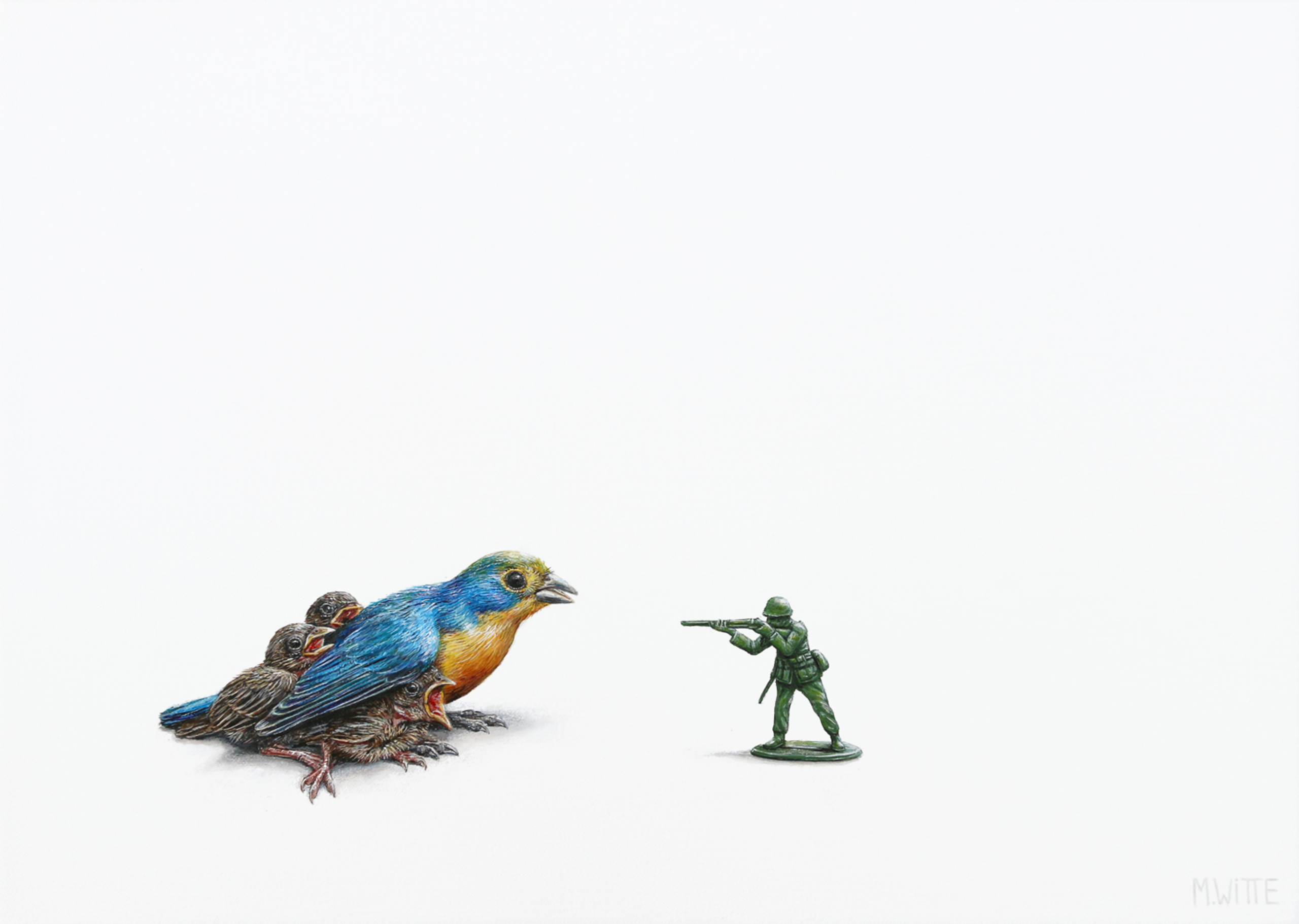 Marcel Witte is een visuele verhalenverteller die de hedendaagse maatschappij subtiel bekritiseert. Zijn schilderijen van dieren tegen een lege achtergrond balanceren tussen realisme en fantasie.