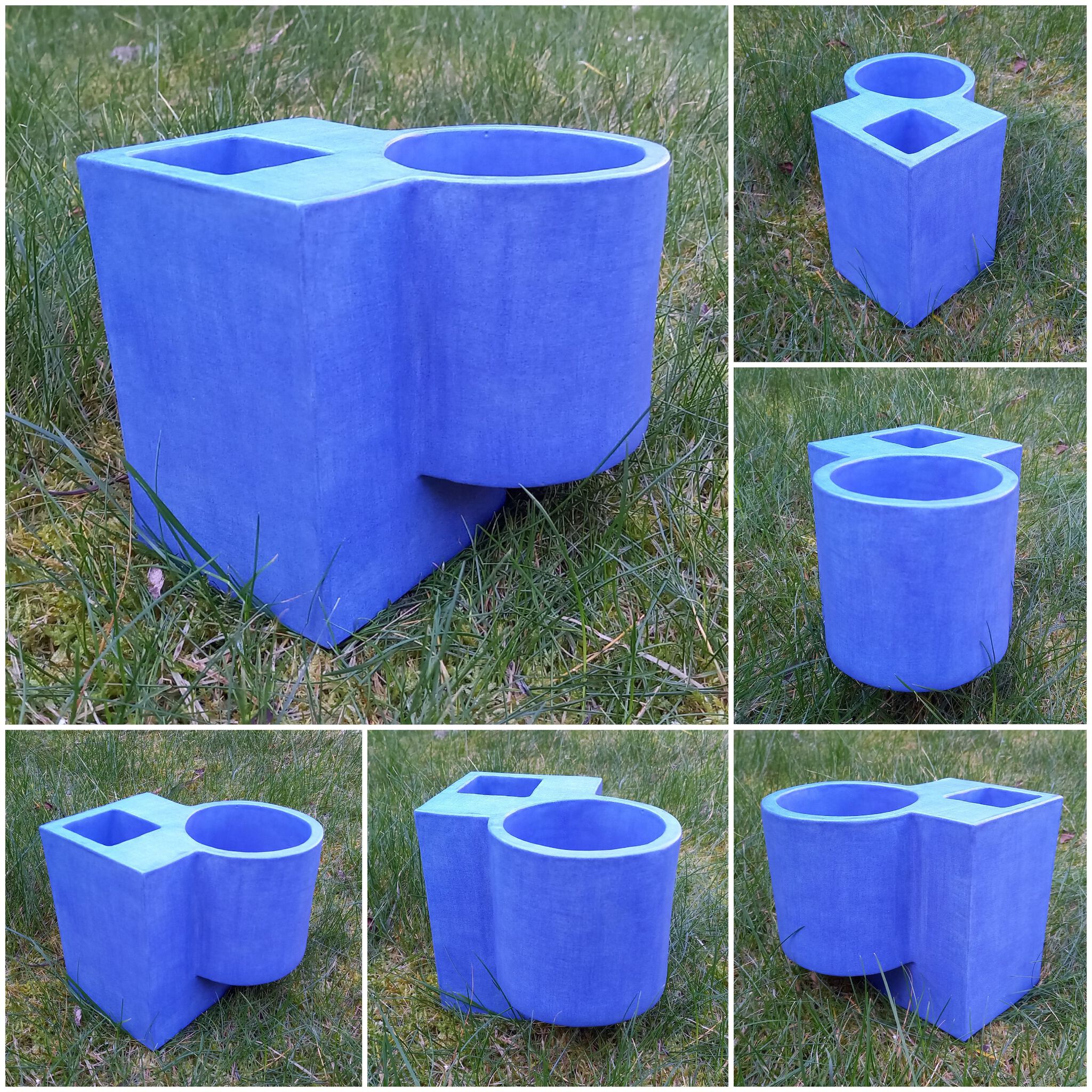 Vaas met dubbel gebruik. Cylinder en kubus. Blauw cobaltglazuur op witte klei.