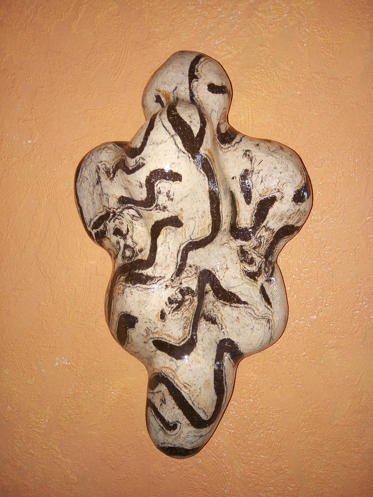 Keramiek : organische handgevormde objecten dmv slabs afgedrukt op linosnede.