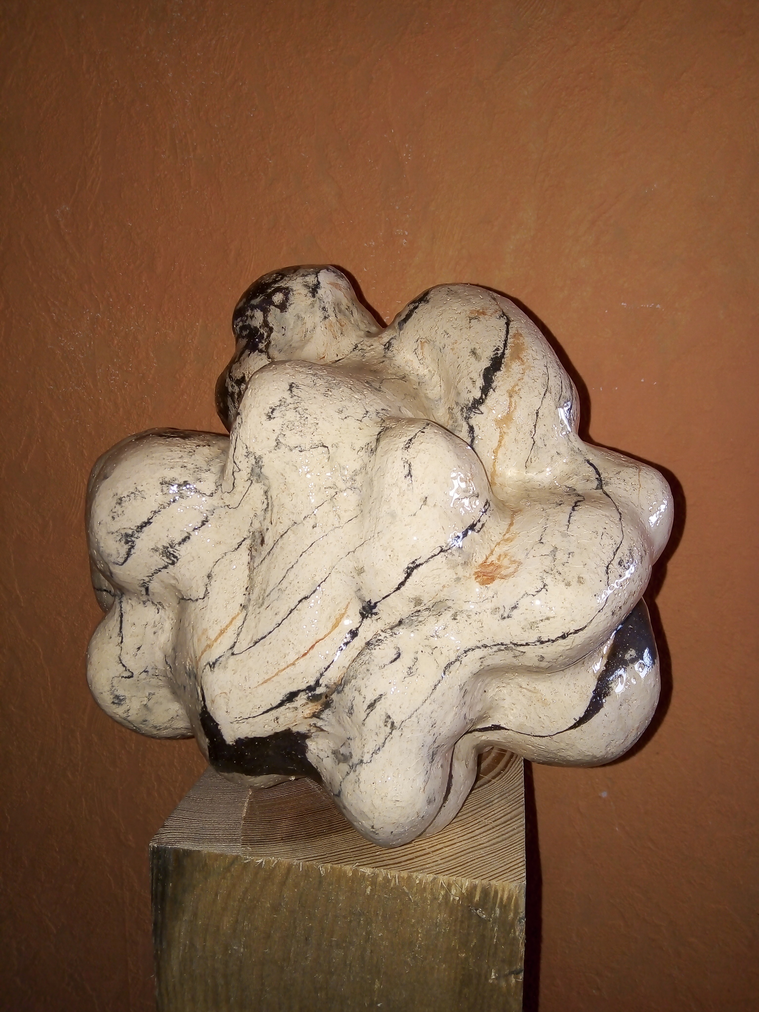 Keramiek : organische handgevormde objecten dmv slabs afgedrukt op linosnede.