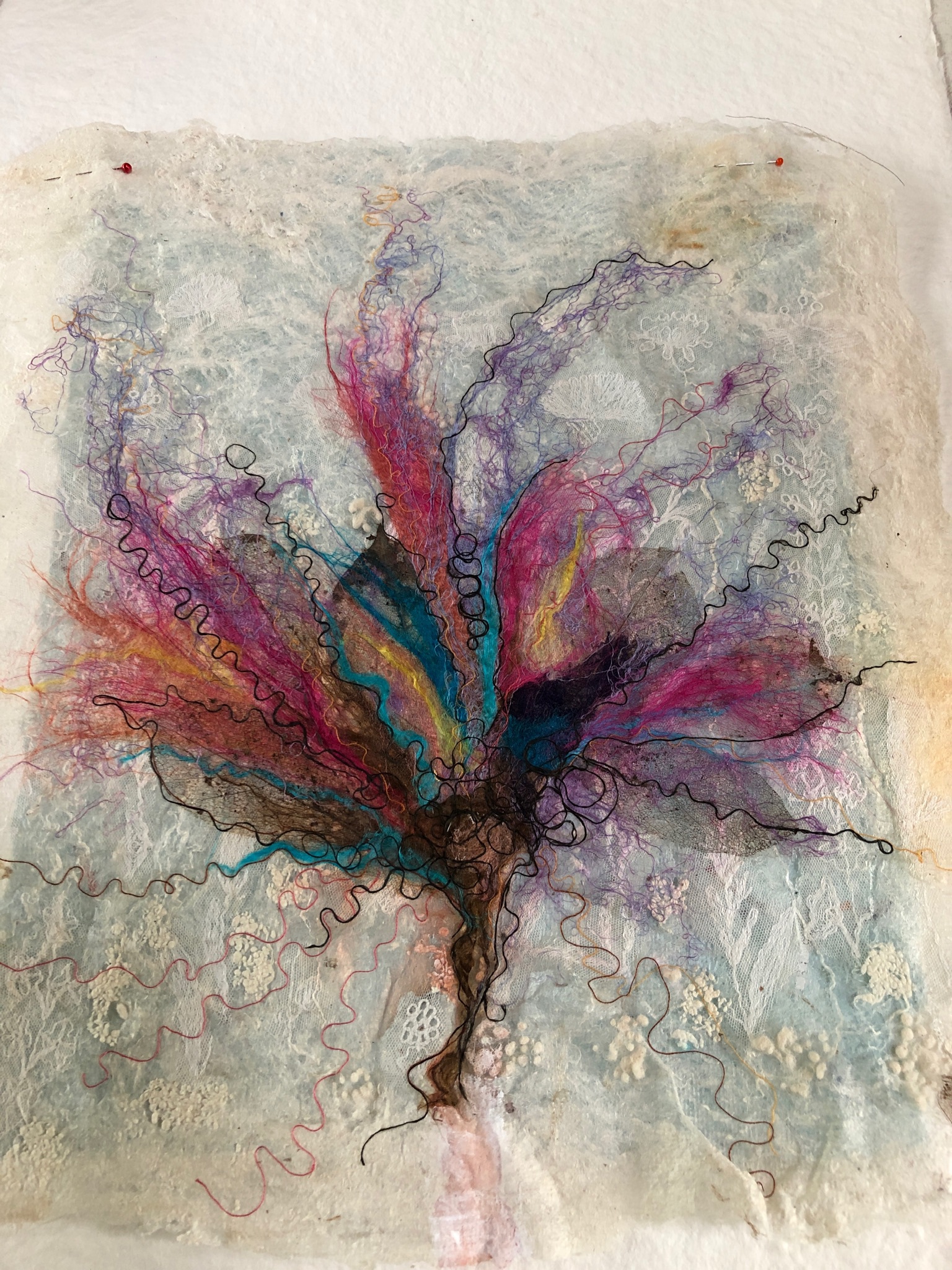 Sybrecht Bosker - Meindertsma [creëert textiele panelen. Tot 2006 gaf zij ook les in Beeldende Vorming op middelbare scholen, maar nu zij hiermee is gestopt heeft ze meer tijd om met verschillende technieken te experimenteren. Wonend aan de Veluwezoom is de natuur in al haar facetten een belangrijke inspiratiebron voor haar. Waar mogelijk wordt de beleving van de omgeving in beeldvorming en materiaalgebruik verwerkt. Ook spelen ervaringen en indrukken opgedaan tijdens verschillende reizen een belangrijke rol in haar werk. Vaak wordt in de panelen gebruik gemaakt van eigen gemaakt zijdevlies. Hierop schildert en borduurt Sybrecht met de hand of machine.