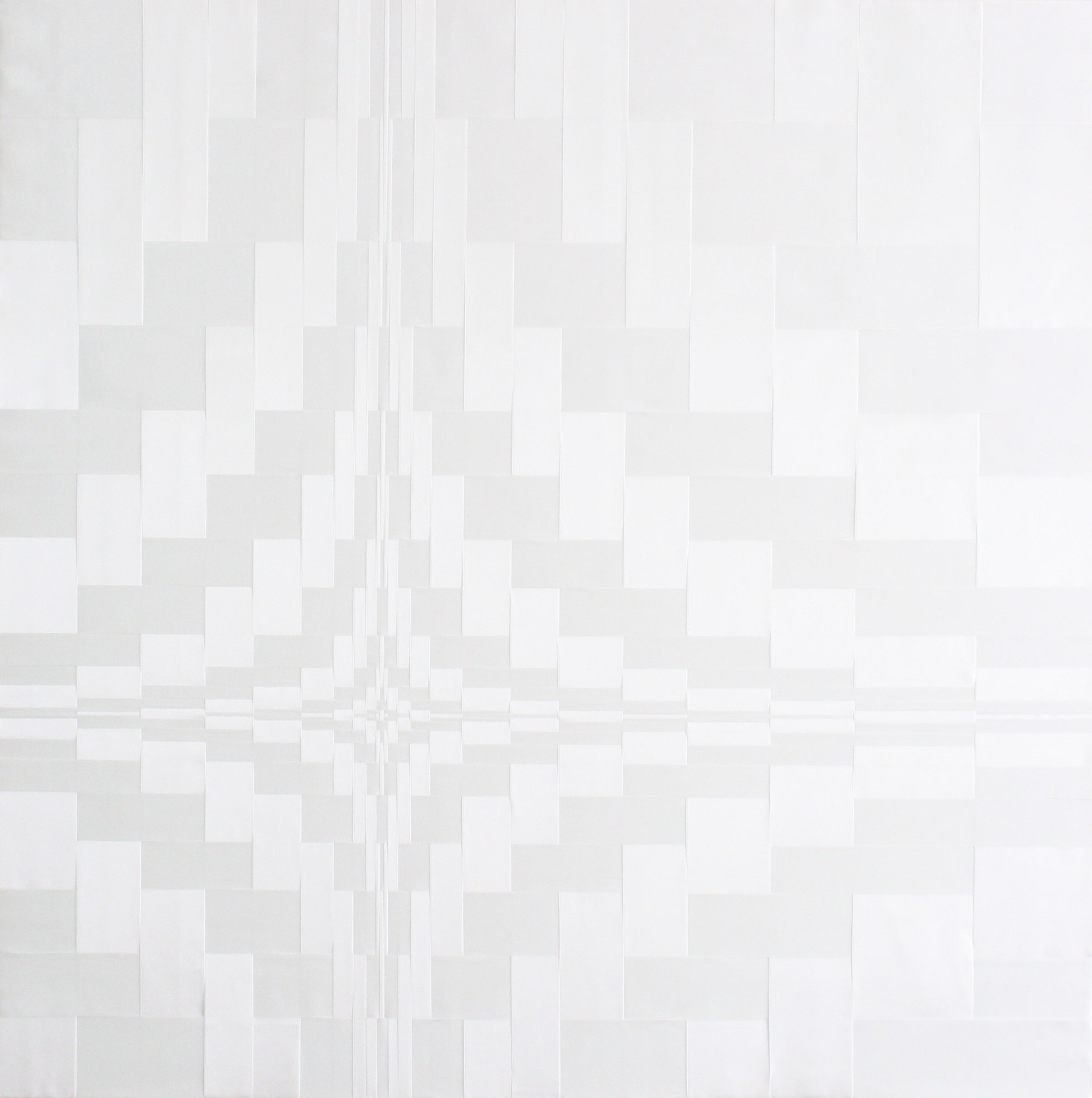 Gevlochten satijnlint dat op een houten alu-frame gespannen is. Door met verschillende opeenvolgende breedtes te werken ontstaat de illusie van 3D rondingen terwijl het een plat vlak is. Ook bij het langslopen lijkt het te bewegen. Gemaakt van 1 kleur wit lint, door de lichtval lijken het 2 kleuren te zijn. Het werk doet denken aan het Chrysler Building in New York. Het werk kan opgehangen worden aan het frame of aan het ophangdraad aan de achterkant.