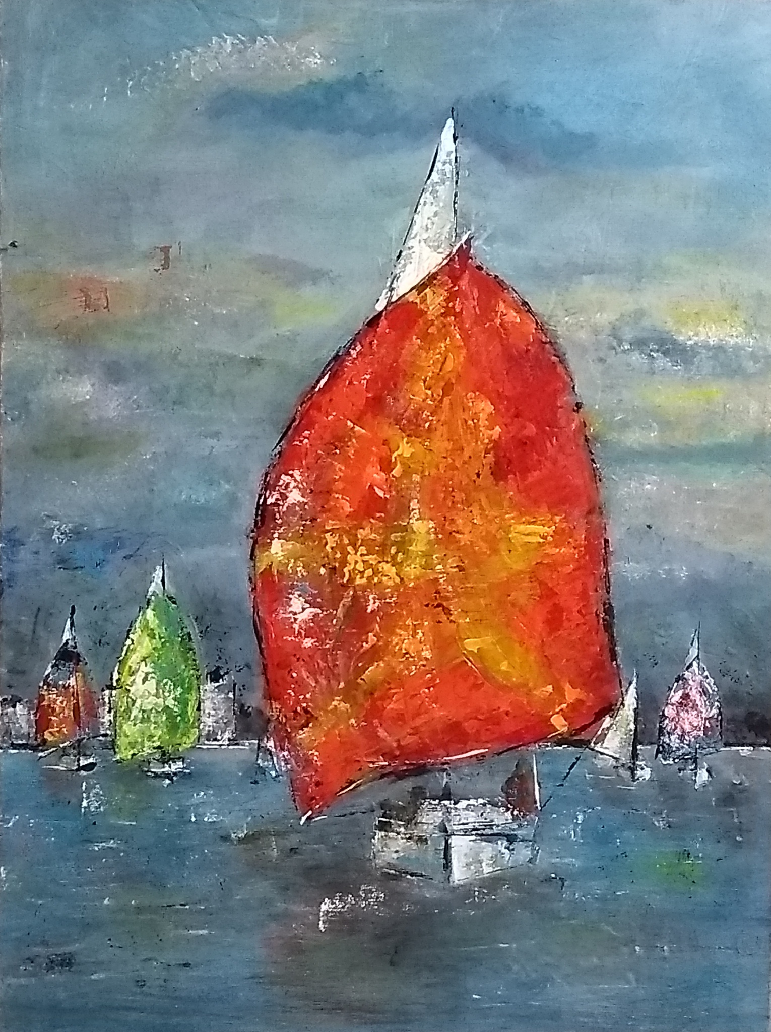 Acryl op doek, met kwast en paletmes. In opdracht gemaakt voor zeilliefhebber.