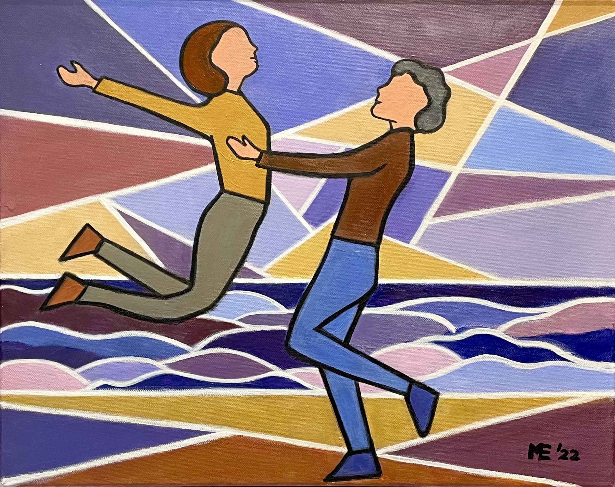 Vrolijke voorstelling van een happy couple op het strand. In zachte pasteltinten en wit omlijnde vlakken.
