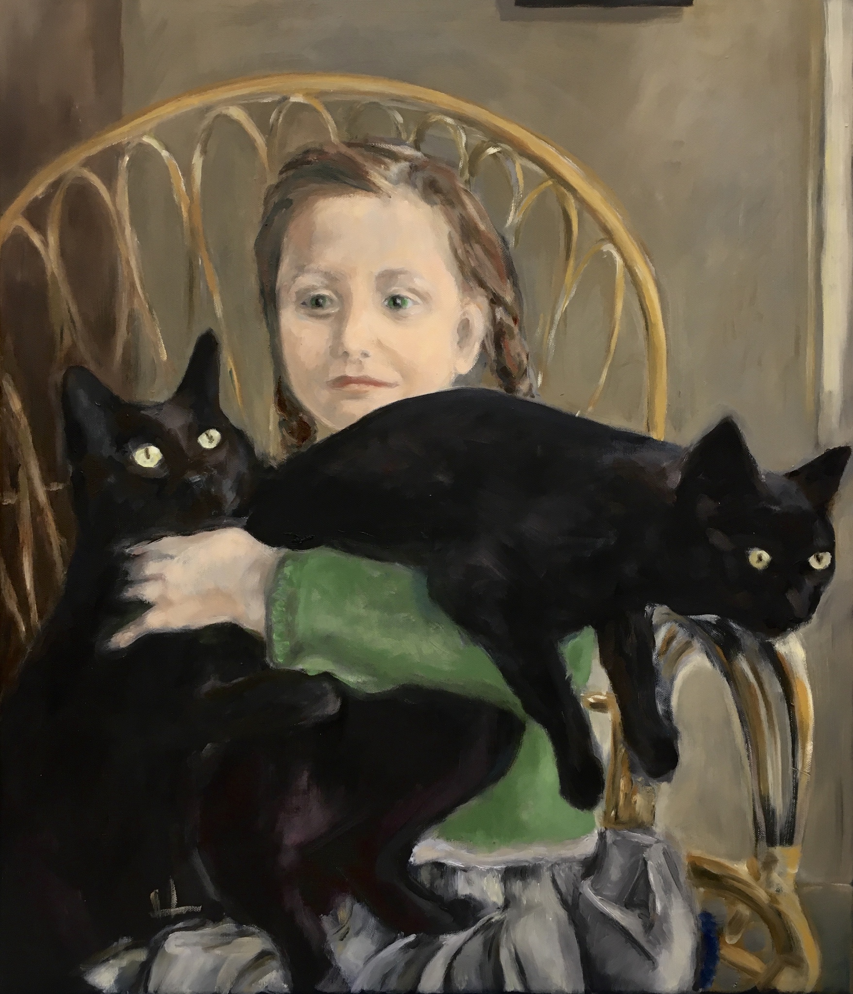 Een portret van een klein meisje met 2 katten; de katten zijn in verhouding iets te groot. Om aan te geven dat dieren in kinderogen groter en belangrijker zijn dan ze werkelijk zijn. Dieren zijn voor kinderen - vooral als ze enigst kind zijn - vaak als broertjes en zusjes.